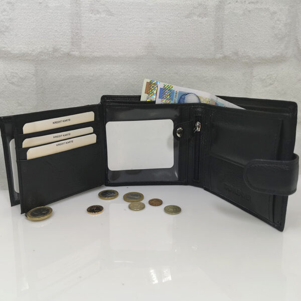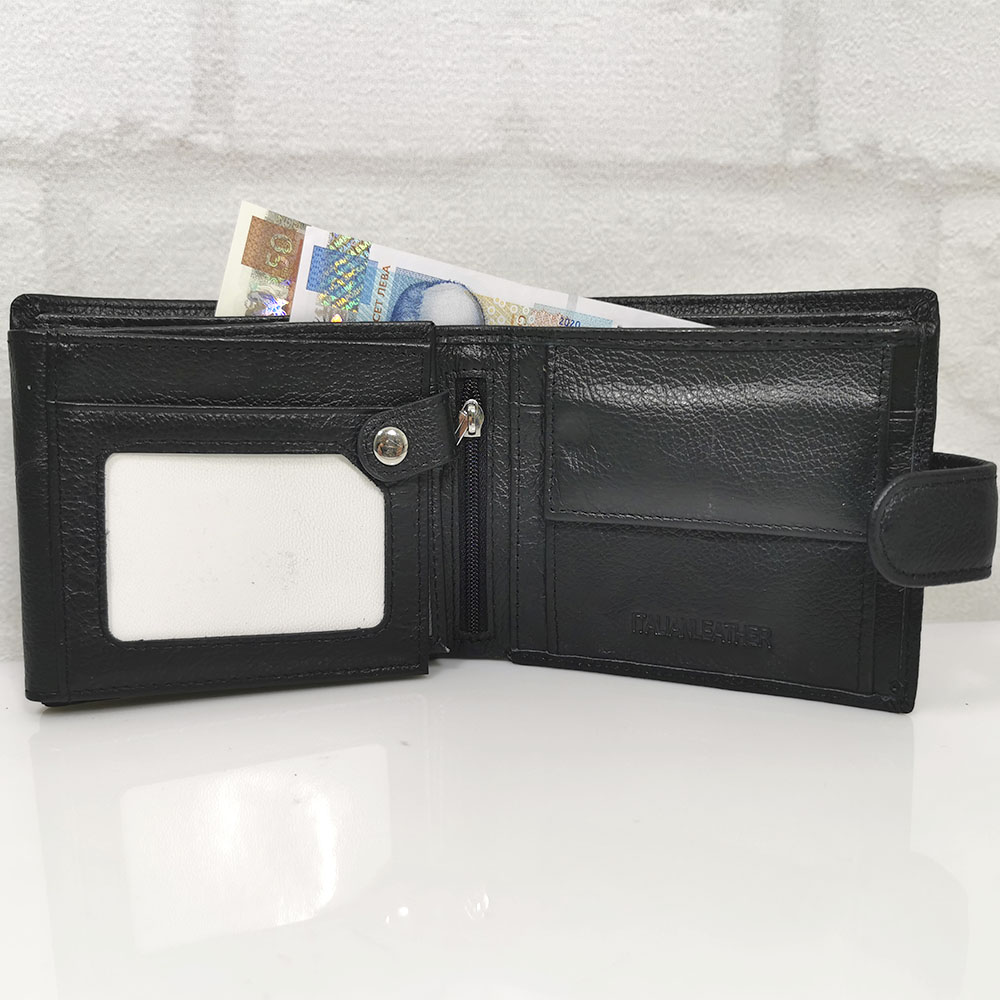 Три отделения за банкноти, като едното е с цип, 8 джобчета с различни размери за визитки или карти, като 4 от тях са прозрачни, монетник с копче тик-так, малко джобче с цип.