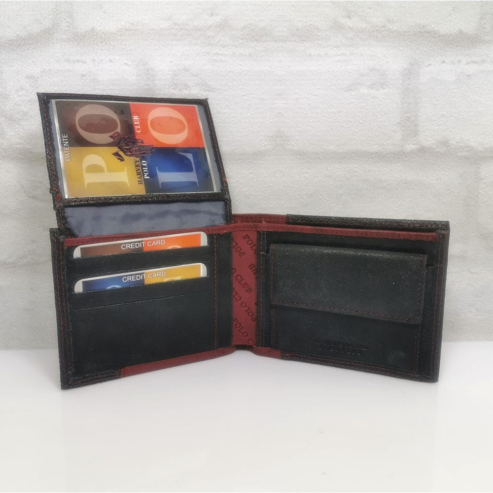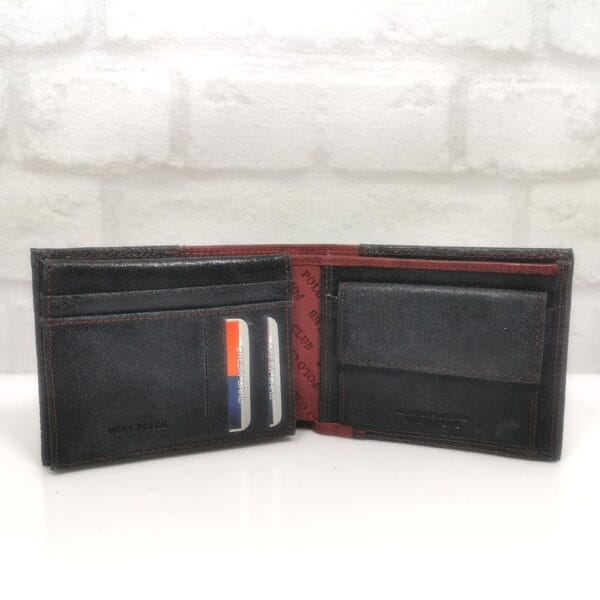 Две прегради за банкноти, монетник с копче тк-так, 10 отделения за визитки, едно голямо прозрачно отделение и още 3 джоба
