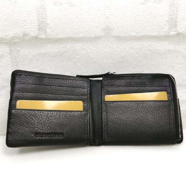 Три отделения за банкноти, като едното е с цип, 13 джобчета с различни размери за визитки или карти, голям монетник с метален цип.