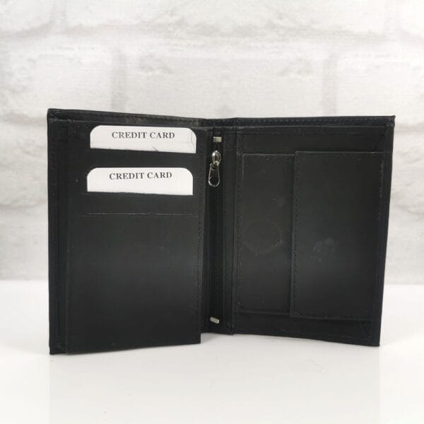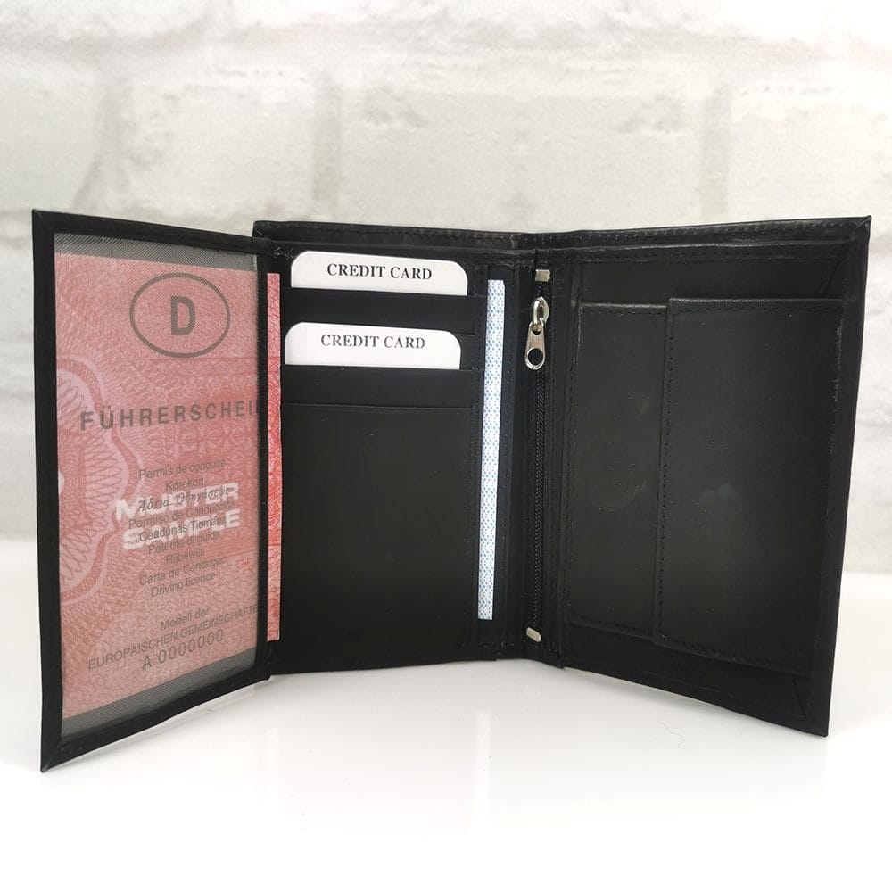 Две отделения за банкноти 12 процепа за карти и документи с различна големина, като едно от тях е прозрачно, малко джобче с цип, монетник с копче тик-так
