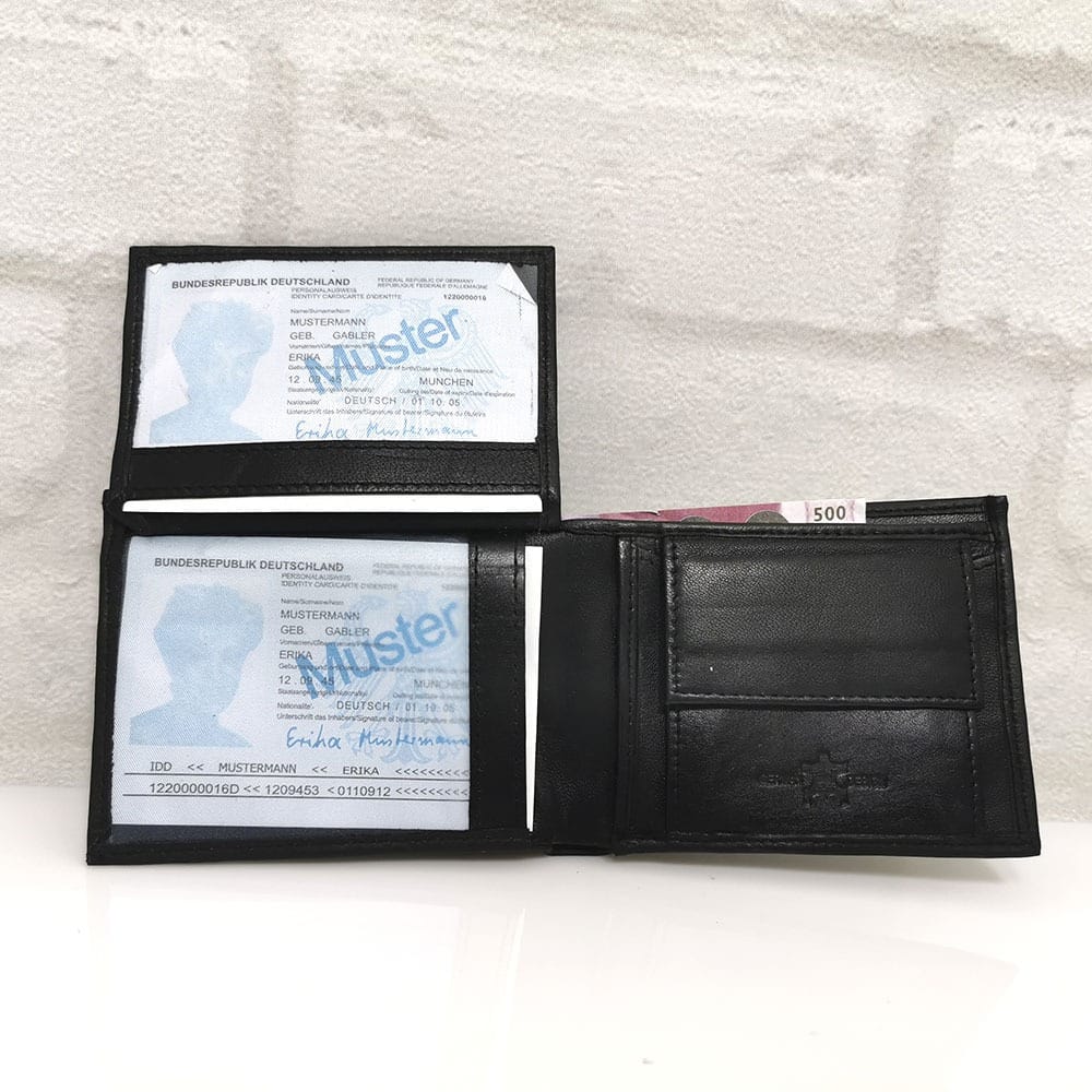 Две отделения за банкноти, като едното се затваря с цип, 6 процепа за карти или документи с различни размери, като 2 от тях са прозрачни, монетник с копче тик-так
