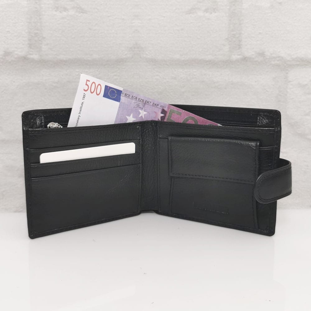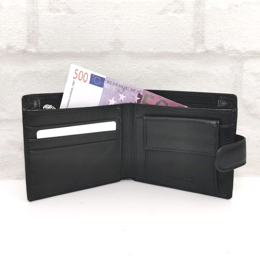 Две отделения за банкноти, като едното се затваря с цип, 5 процепа за карти или документи с различни размери, монетник с копче тик-так