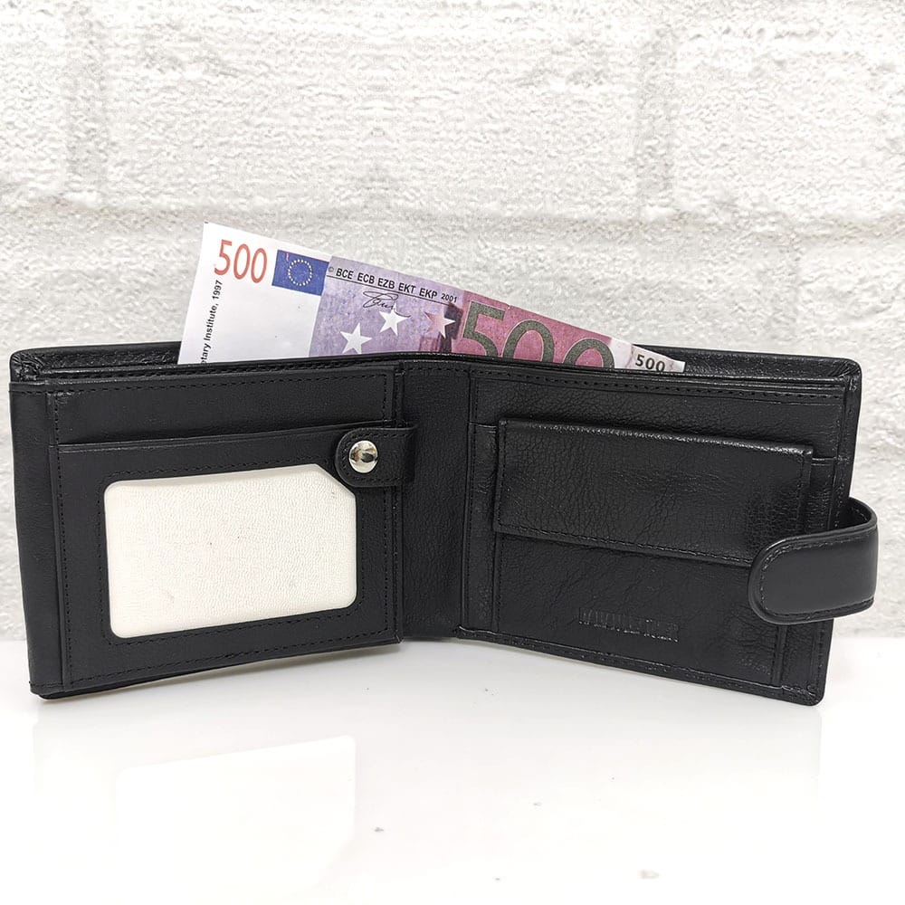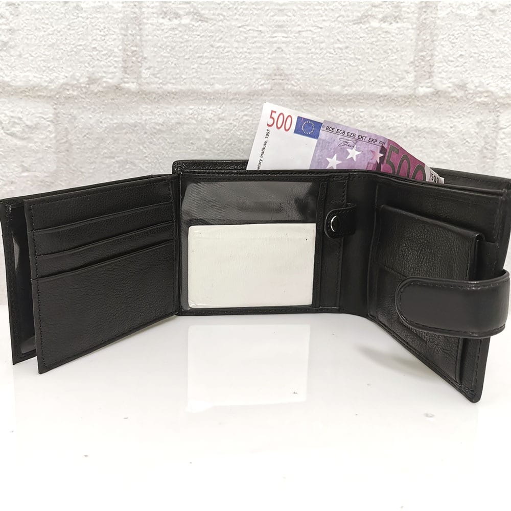 Три отделения за банкноти, като едното се затваря с цип, 9 процепа за карти или документи с различни размери, като 4 от тях са прозрачни, монетник с копче тик-так