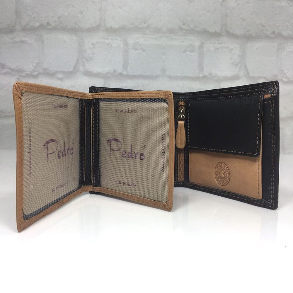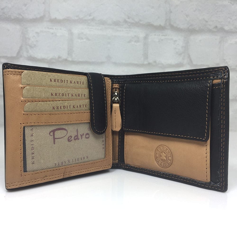 Две прегради за банкноти, монетник с копче тик-так, 12 отделения за визитки, 2 големи прозрачни отделения, още 2 непрозрачни прегради по дължината на портмонето и малка преграда с цип