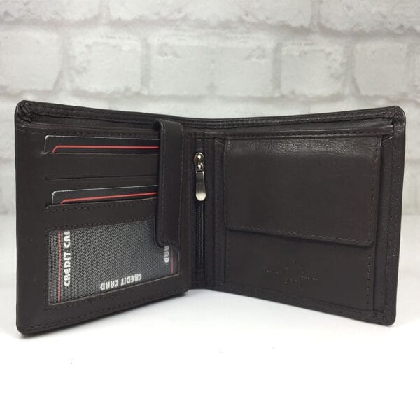 Две прегради за банкноти, монетник с копче тик-так, 11 отделения за визитки, 2 големи прозрачни отделения, още 2 непрозрачни прегради по дължината на портмонето и малка преграда с цип