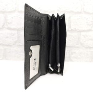 Три отделения за банкноти, като едното е с цип, 14 джобчета с различни размери за визитки или карти, като едно от тях е прозрачно, монетник с копче тик-так
