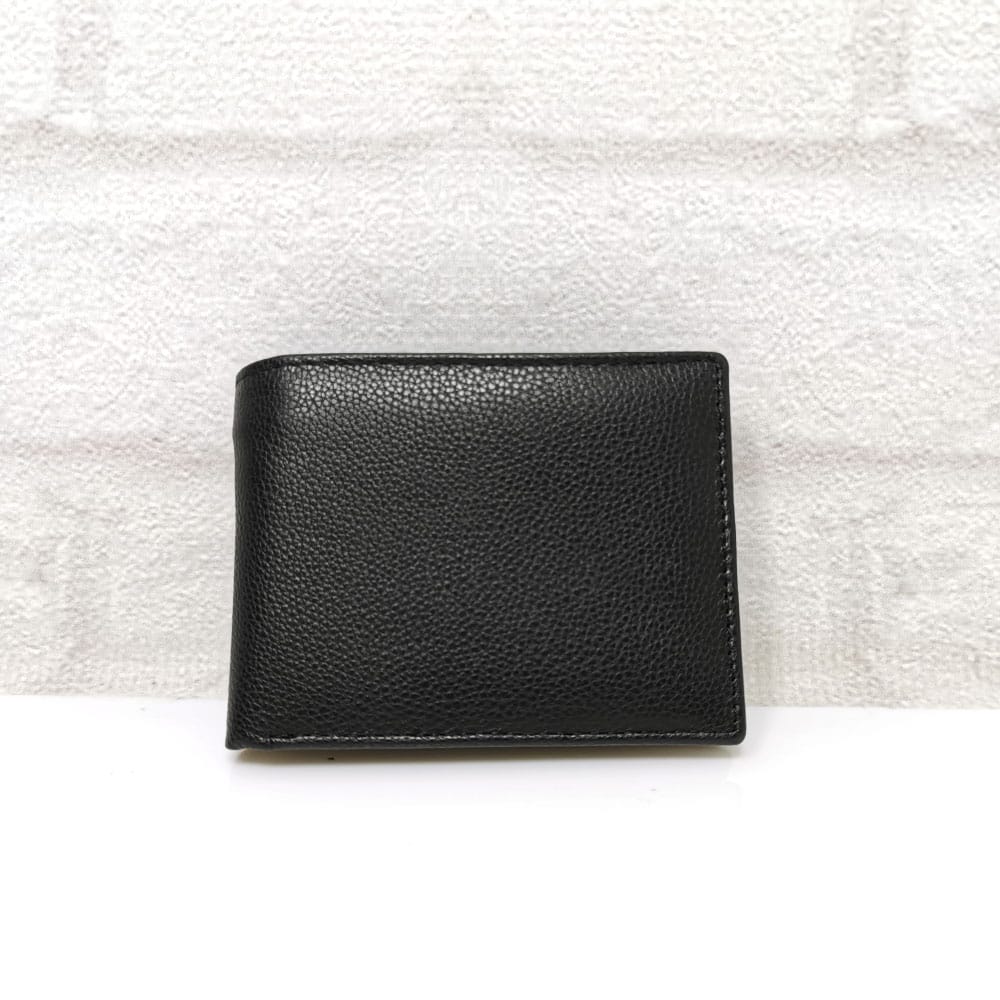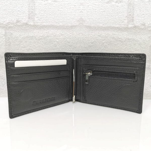 Три отделения за банкноти, като едното е с цип, 6 джобчета с различни размери за визитки или карти, монетник с цип, подвижна метална щипка за банкноти.
