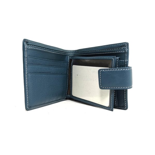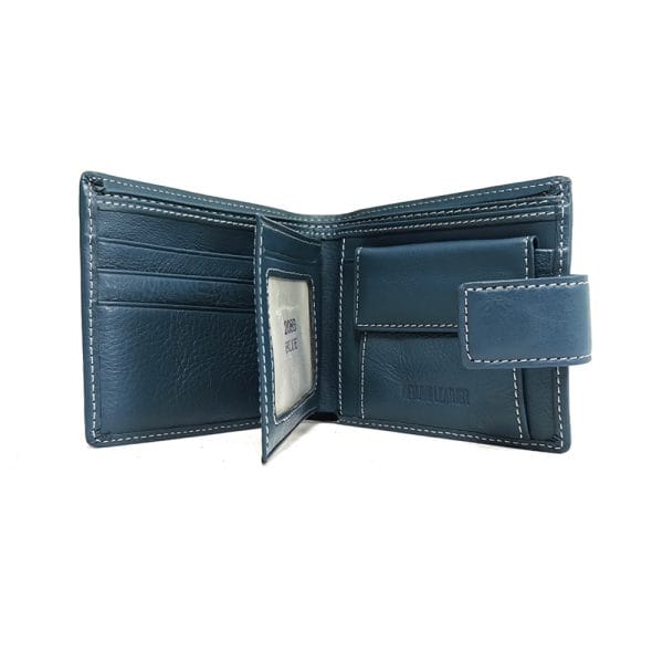 Портфейл от синя естествена кожа , мека и приятна на допир, закопчава се с скрито магнитно копче.