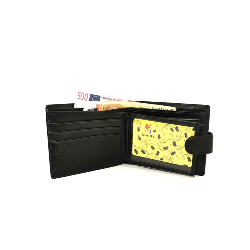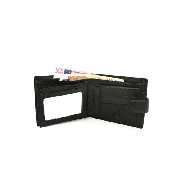 Три отделения за банкноти, като едното е с цип, 7 джобчета за визитки или карти, като 2 са прозрачни, вътрешен монетник с копче тик-так.