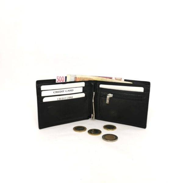 Три отделения за банкноти, като едното е с цип, 6 джобчета за визитки или карти, вътрешен монетник с цип, подвижна метална щипка за банкноти.