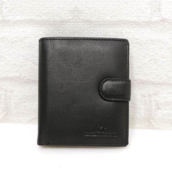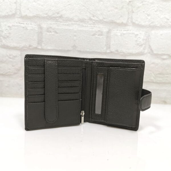 Две отделения за банкноти, 13 джобчета с различни размери за визитки или карти, като 1 е прозрачно, едно малко джобче с цип, монетник с копче тик-так.