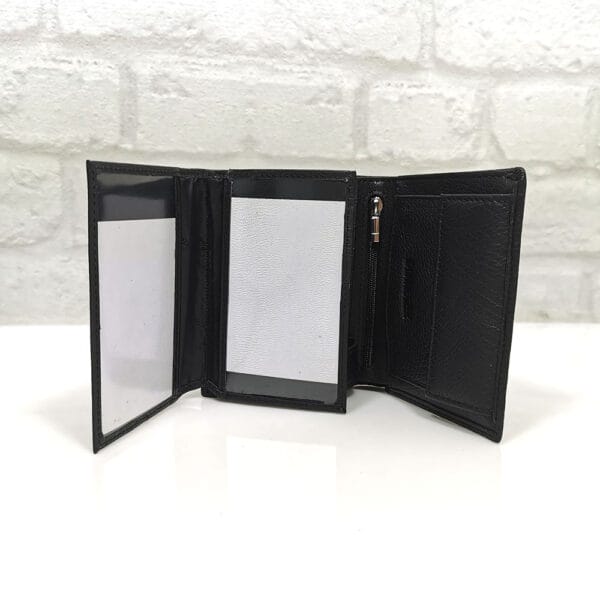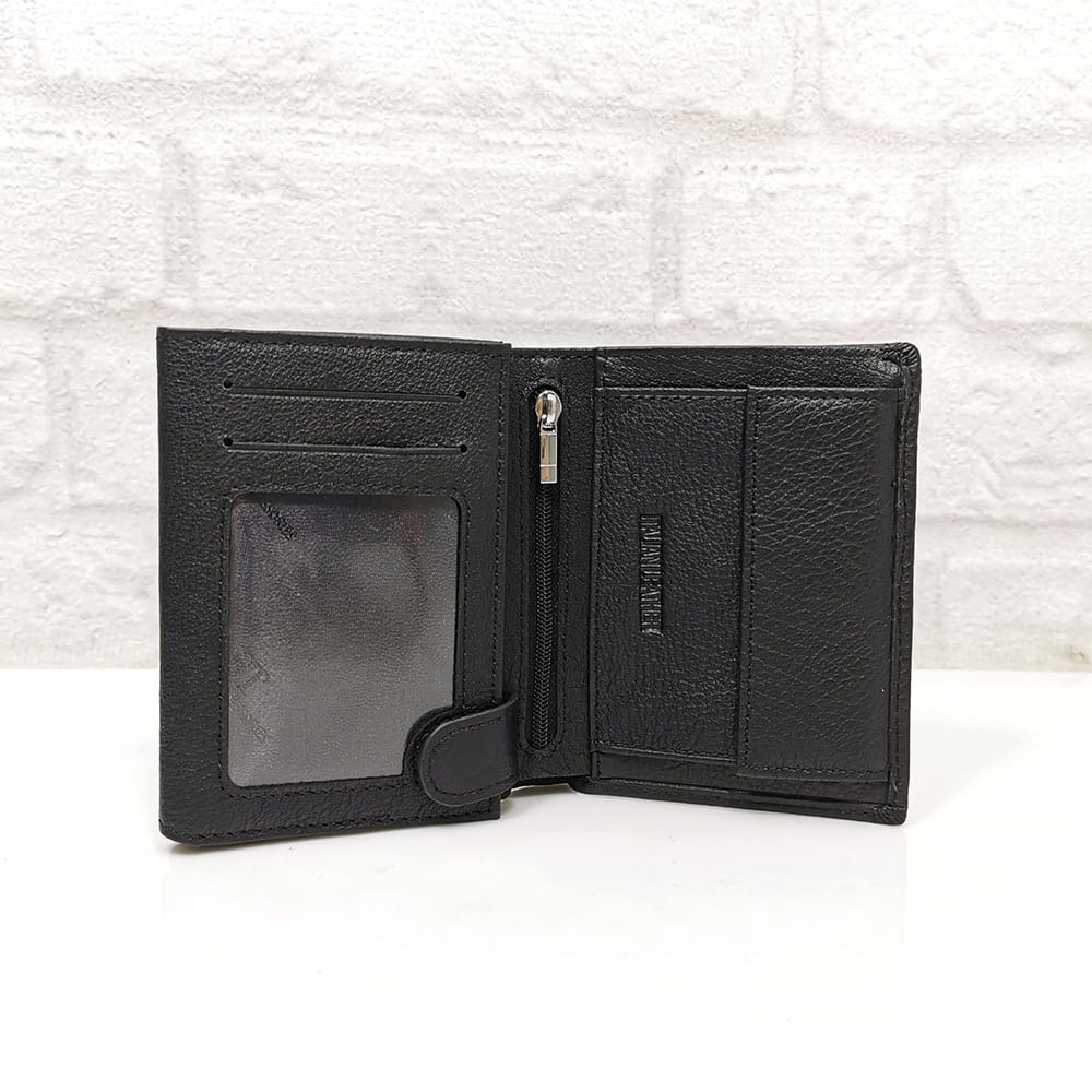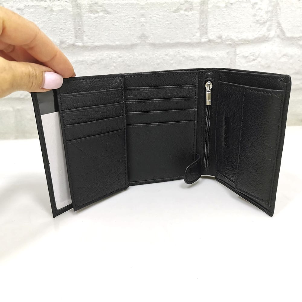 Две отделения за банкноти, 13 джобчета с различни размери за визитки или карти, като 3 са прозрачни, едно малко джобче с цип, монетник с копче тик-так.
