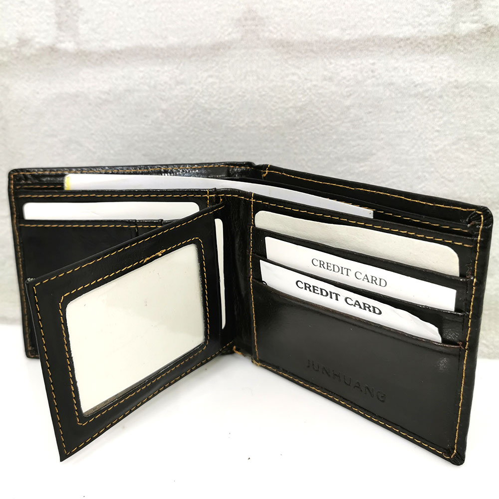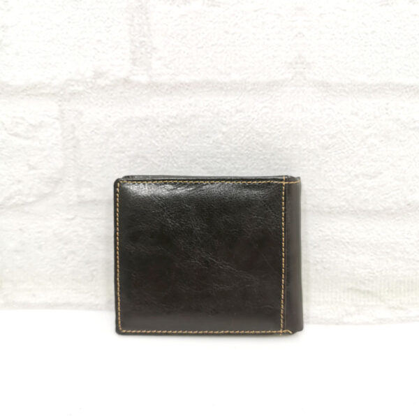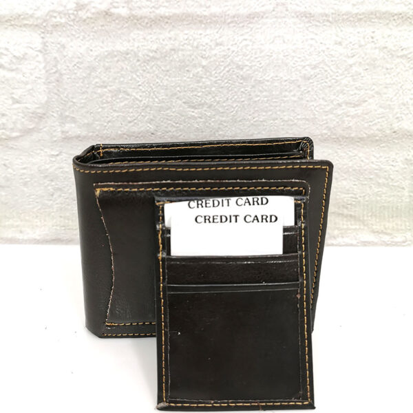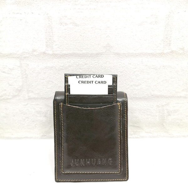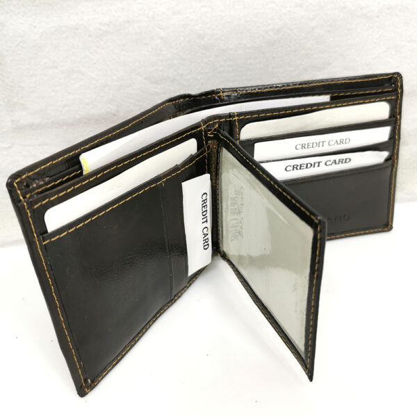 Две прегради за банкноти, 14 отделения за карти или визитки с различен размер, като 2 от тях са прозрачни, отвън на гърба има процеп, в който има подвижен визитник за 3 визитки или карти, без монетник.