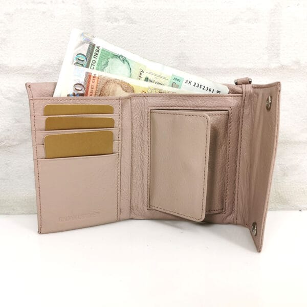 Френски монетник с копче тик-так, отвътре 7 джобчета с различни размери, отвън на гърба джобче с цип