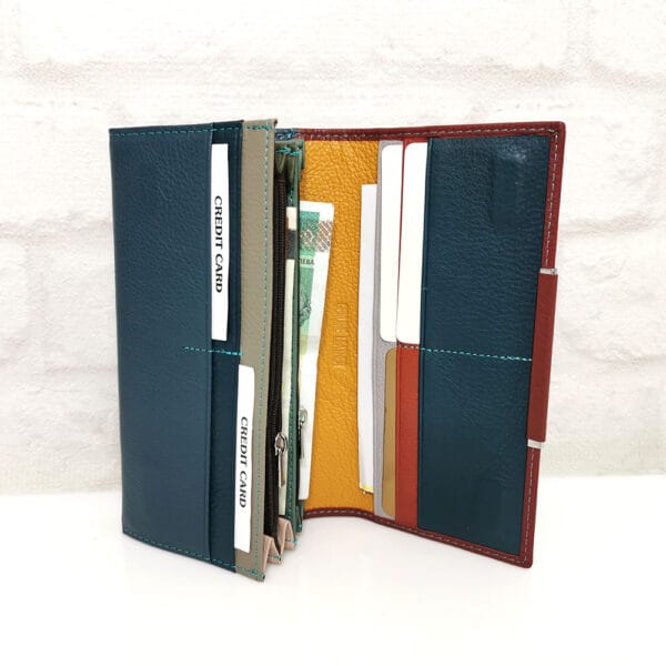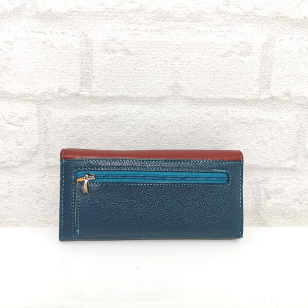 Бордо с тъмно синьо, вътре многоцветно (съчетанието от цветове вътре в портмонето може да са различни от тези на снимката)