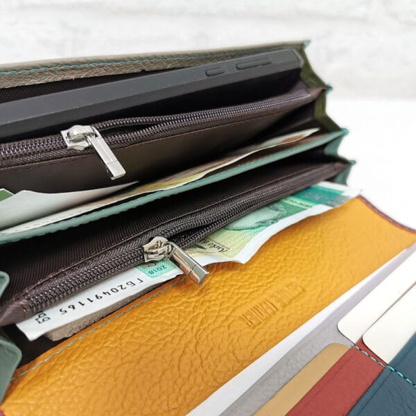 Основна част: 7 големи прегради, две от които се затварят с ципове, 8 малки отделения за карти или визитки, отвън на гърба джоб с цип