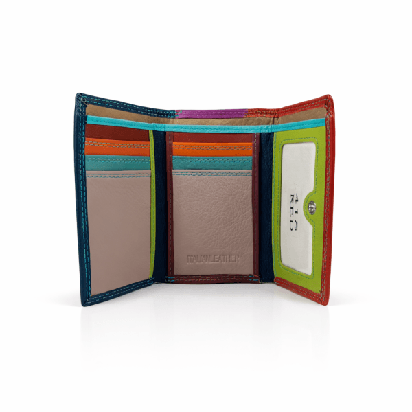 Едно отделение за банкноти, 9 процепа за карти с различна големина, 1 от които е прозрачно, голям монетник с цип