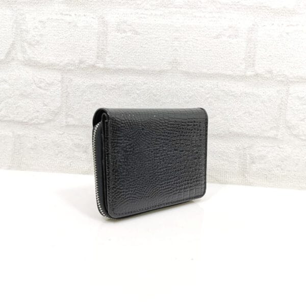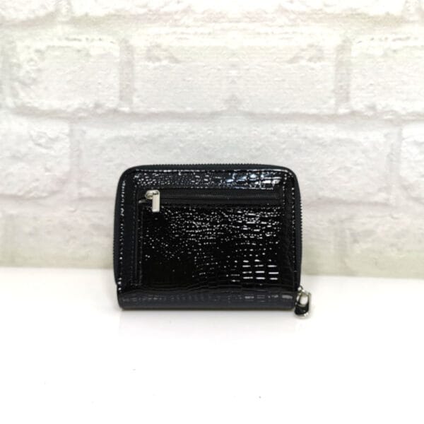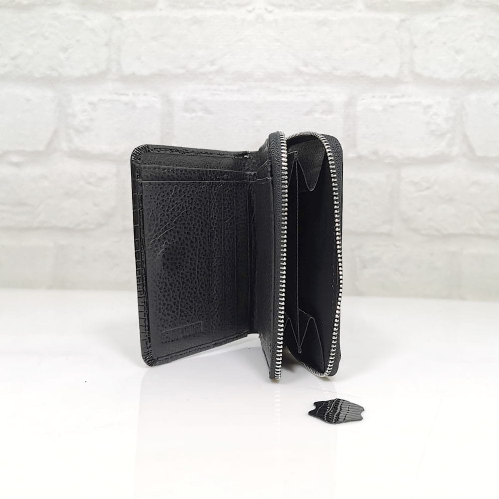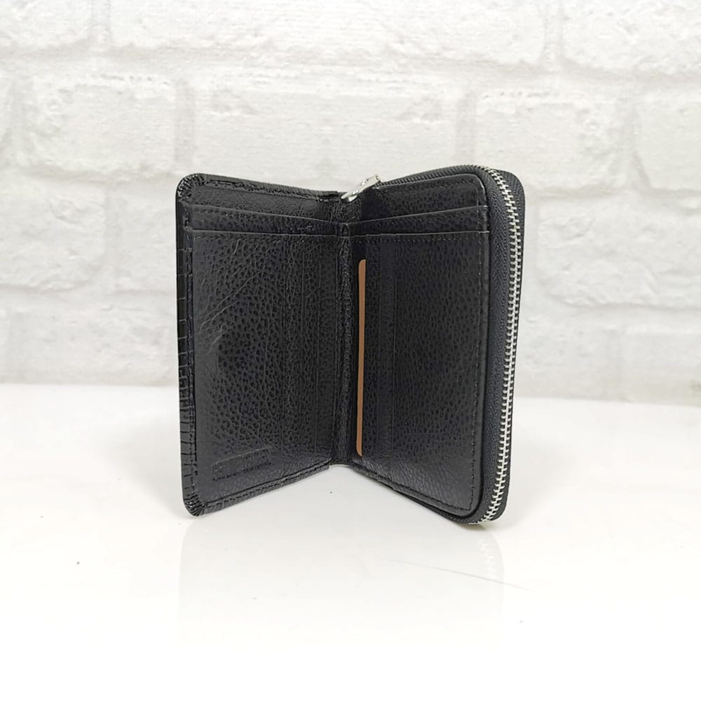 Две прегради за банкноти, 8 процепа за карти или визитки, голям външен монетник с метален цип и средна преграда, на гърба джобче с обикновен цип.