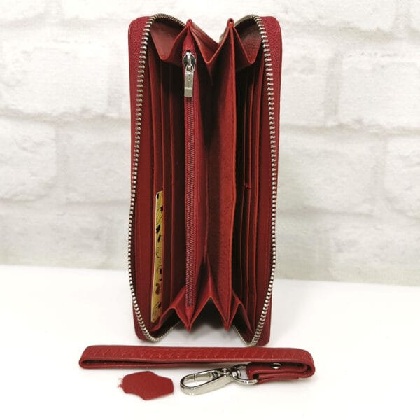 Отвътре-4 големи прегради за банкноти, монетник с цип, 8 отделения за визитки или карти