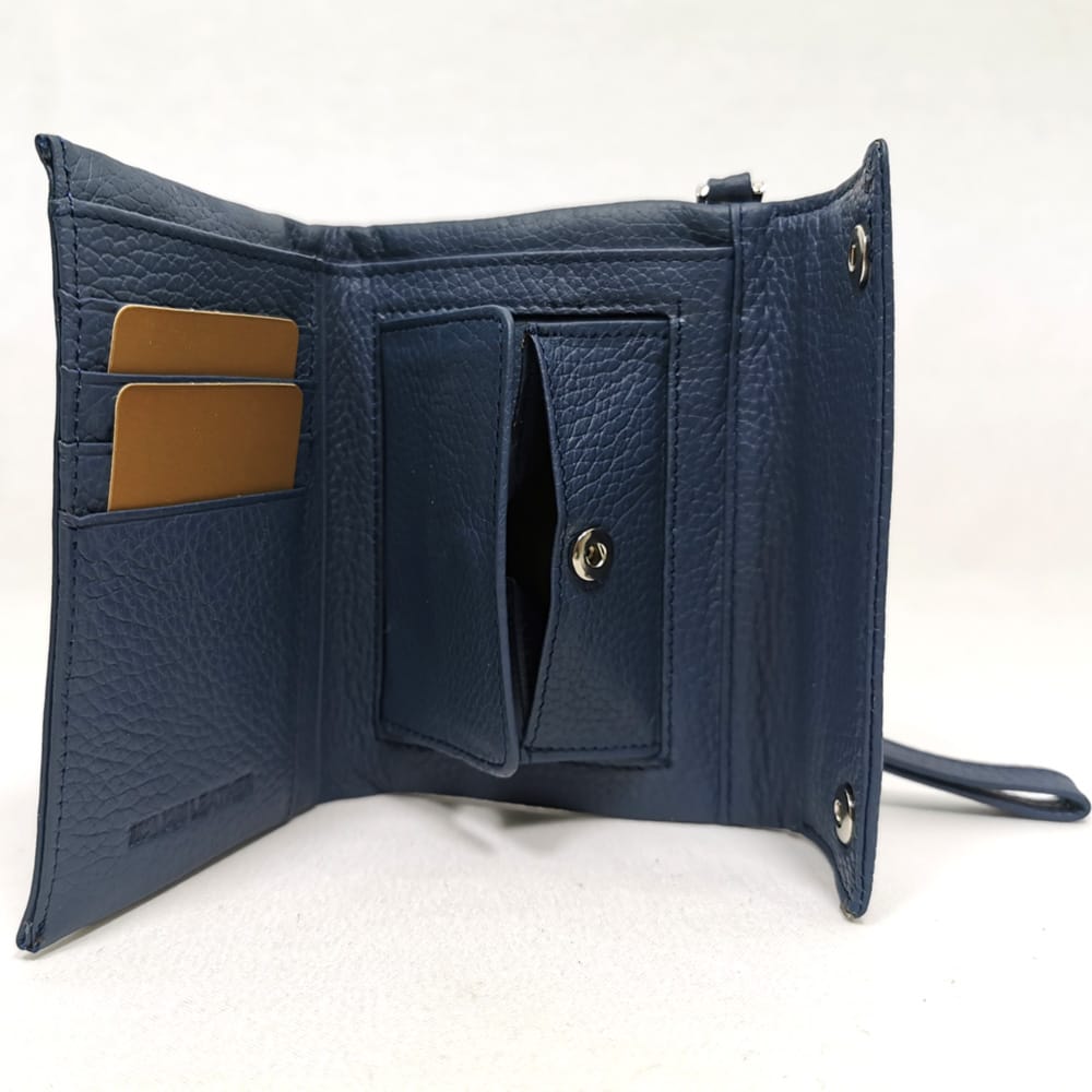 Френски монетник с копче тик-так, отвътре 7 джобчета с различни размери, отвън на гърба джобче с цип