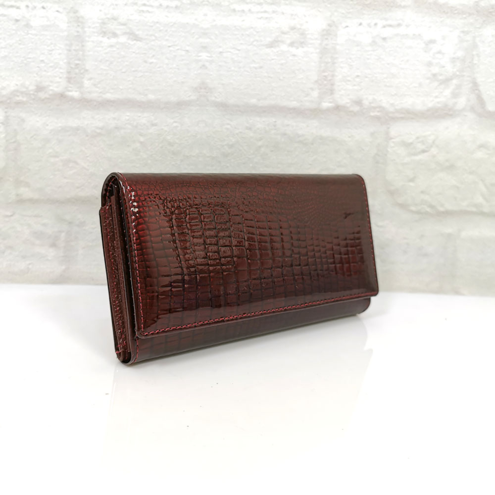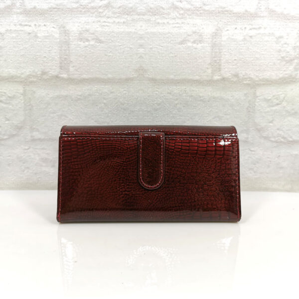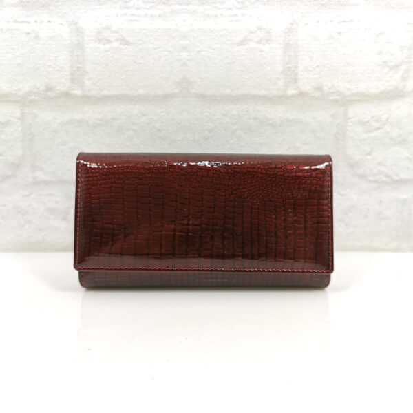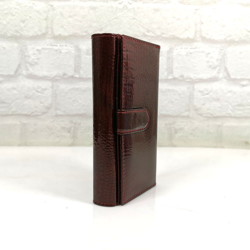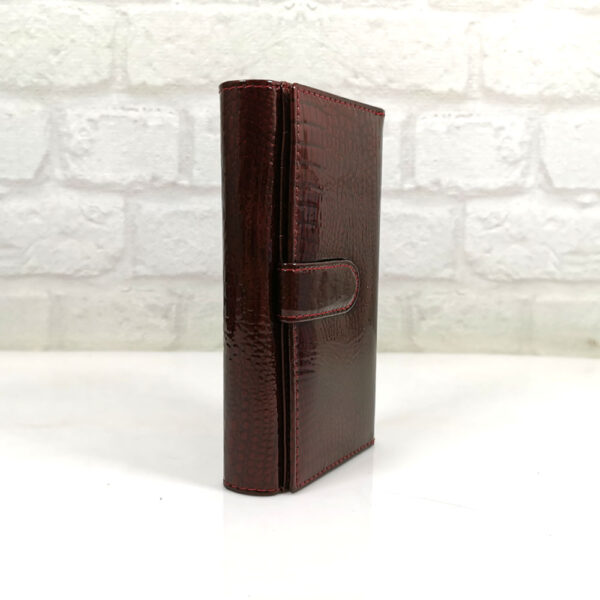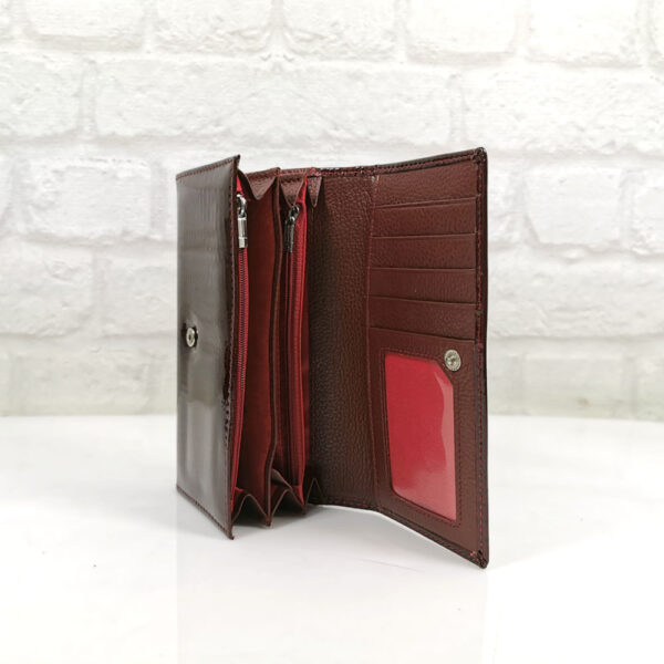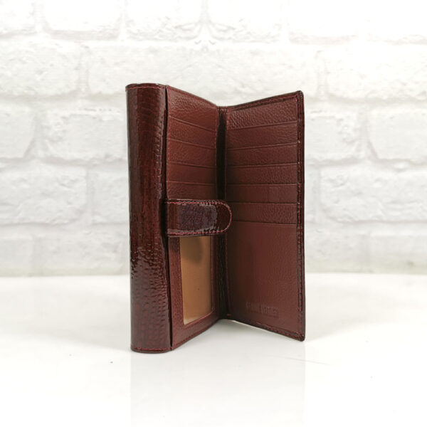 Две отделения- едното е за банкноти и монети с 6 прегради, като двете са с цип и на капака от вътрешната страна има 5 джобчета за карти, като единият е прозрачен. Второто отделение е за карти и визитки с 11 джобчета, като едното е прозрачно и един голям джоб. Затваря се с копче тик-так