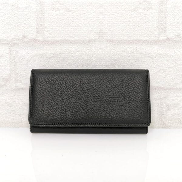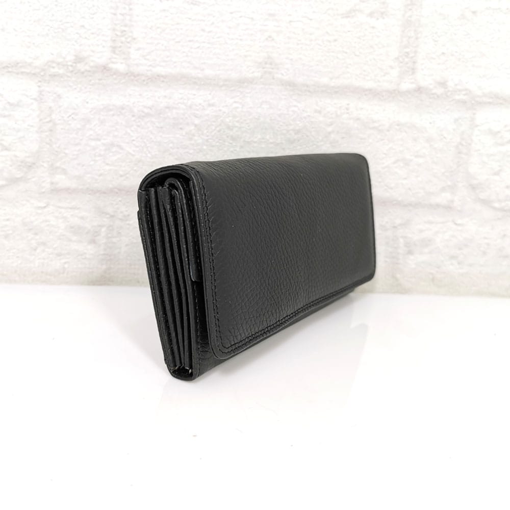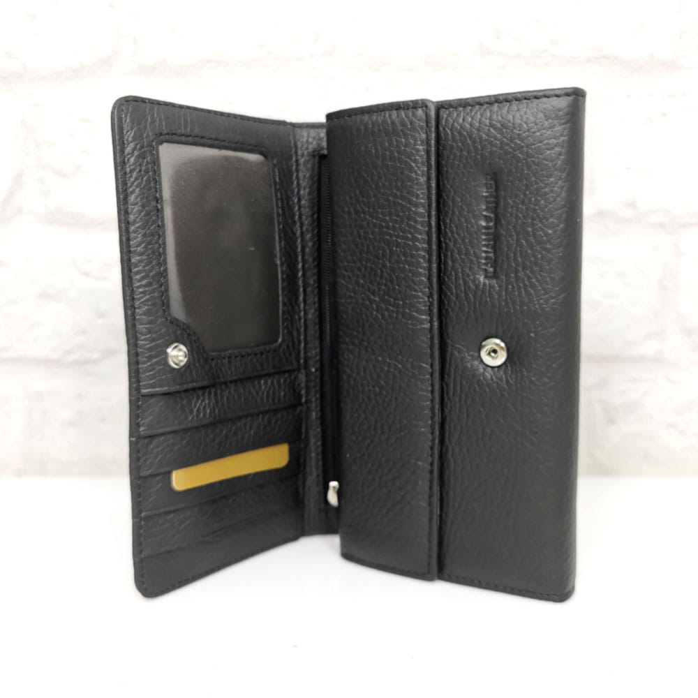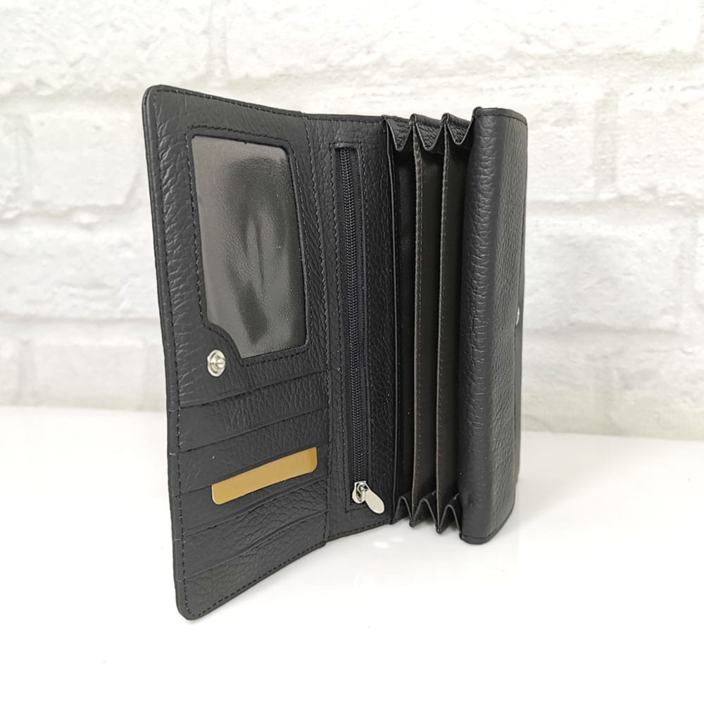 Вътре 5 отделения едното с цип, 5 джобчета за карти едното е прозрачно, голям монетник с капак с копче тик-так