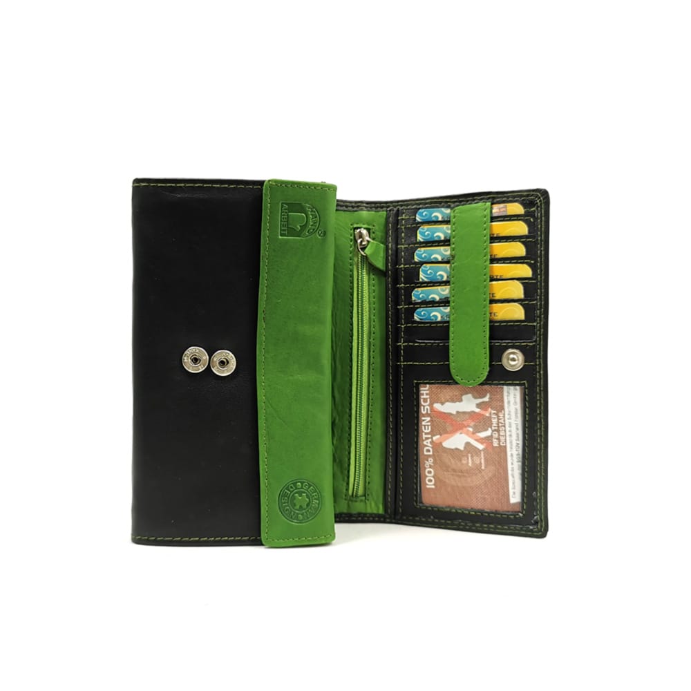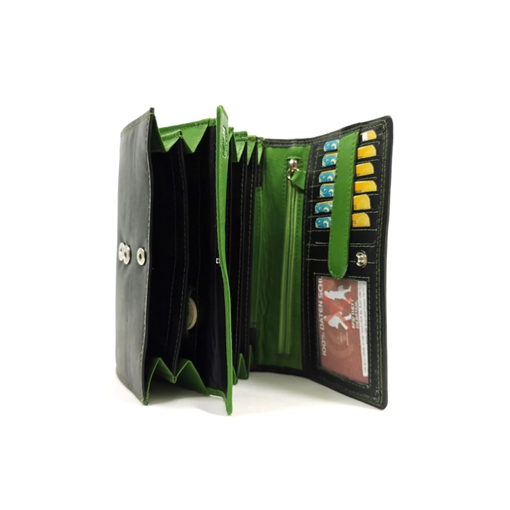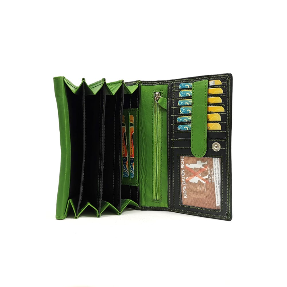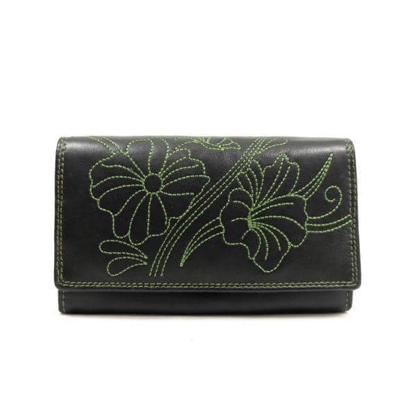 Портмоне от естествена кожа, черно със зелена бродерия, голямо-GAP 3015HZE