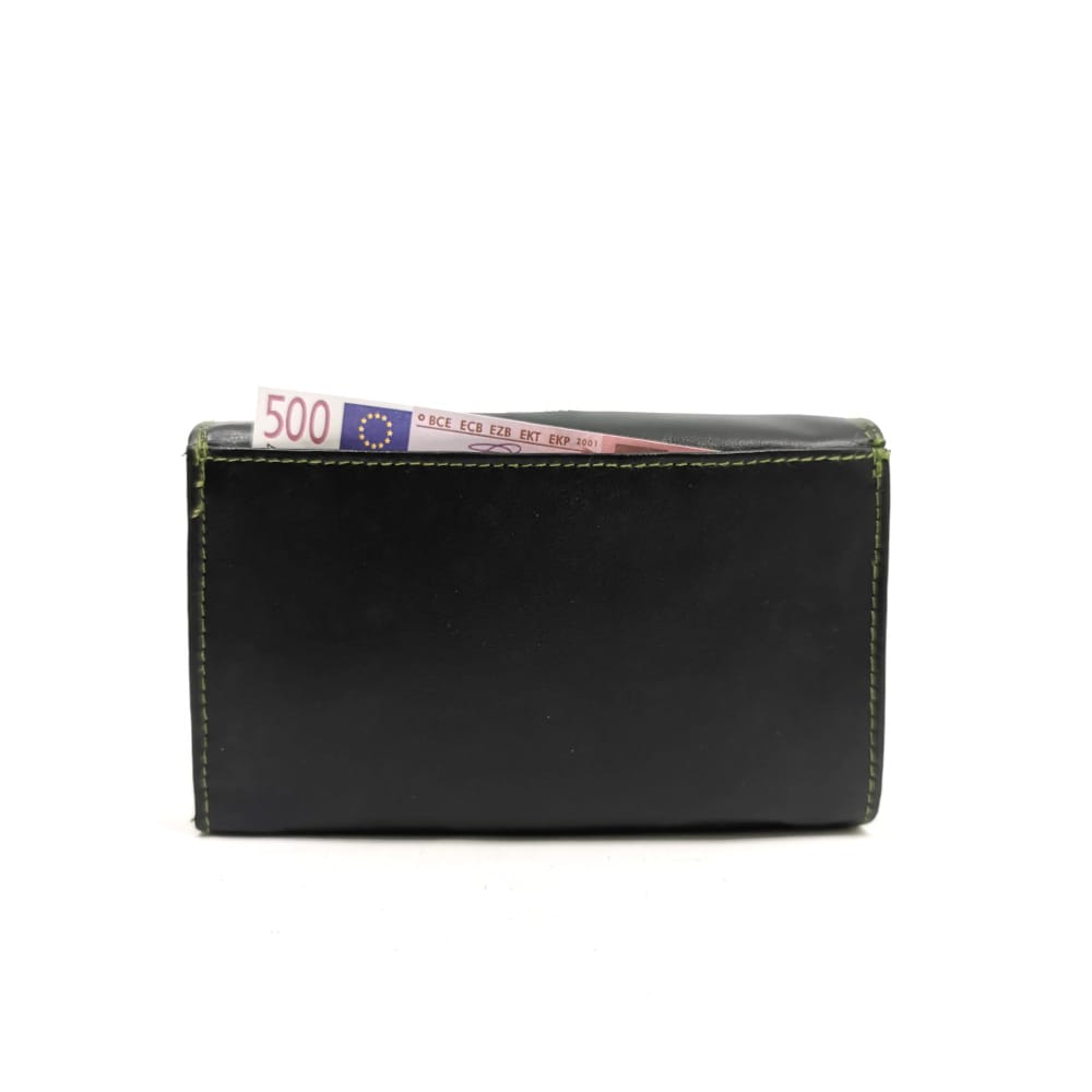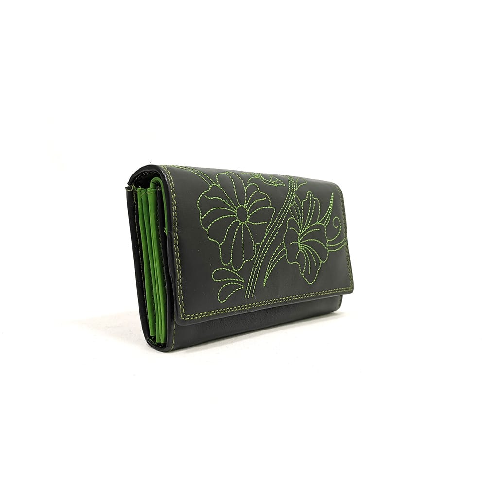 Елегантно черно портмоне с фина зелена бродерия-акцент, който подчертава стила и индивидуалността. Изработено от висококачествена естествена кожа, с прецизна изработка и практично вътрешно разпределение.