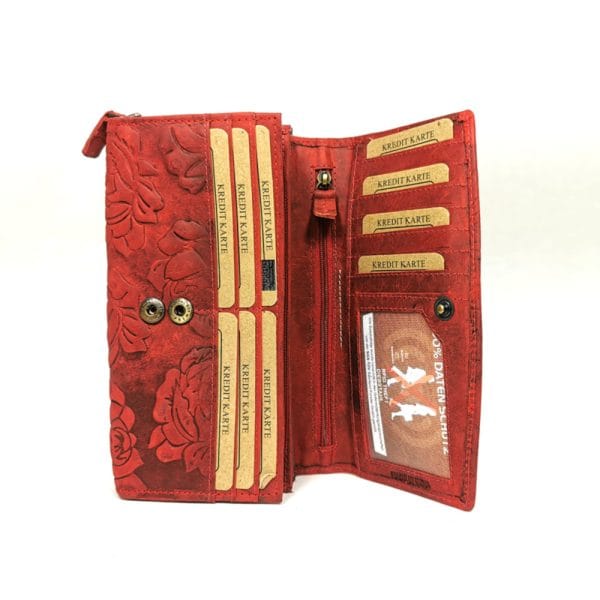 В основното отделение: 4 прегради за банкноти, голям монетник с цип, разделен на 2 с преграда, малко джобче за 1 житон или монета за количките за пазаруване в супермаркетите, джоб с цип, отпред 6 прегради за карти. На капака 8 прегради за карти, като едната е прозрачна и една голяма преграда, отвън на гърба джоб без зкопчаване и един джоб цип.