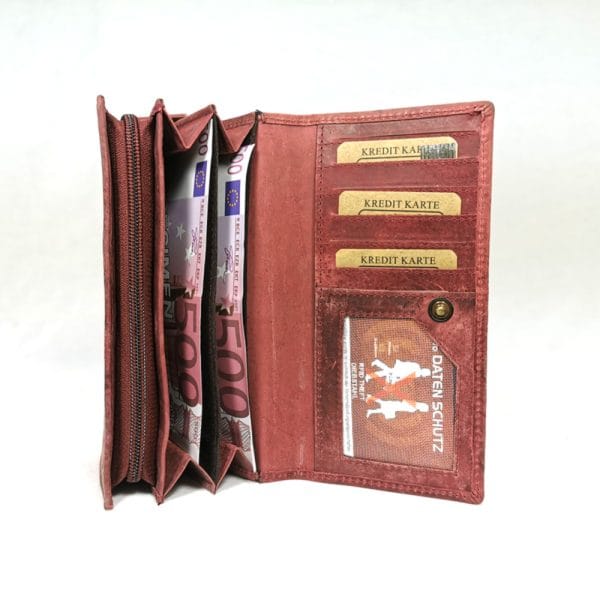 Основна част: 3 прегради за банкноти, голям монетник с цип и средна преграда; на капака една преграда и 7 прегради за визитки, като едната е прозрачна; на гърба органайзер с копче тик-так в който има 2 големи прегради и 16 прегради за карти, като едната от тях е прозрачна