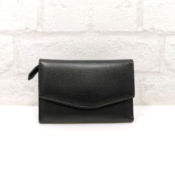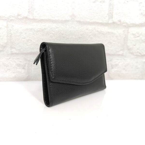 Едно дълбоко отделение за банкноти, процепа за карти или визитки, 1 от които е прозрачно, две вертикални прегради, монетник с метален цип.