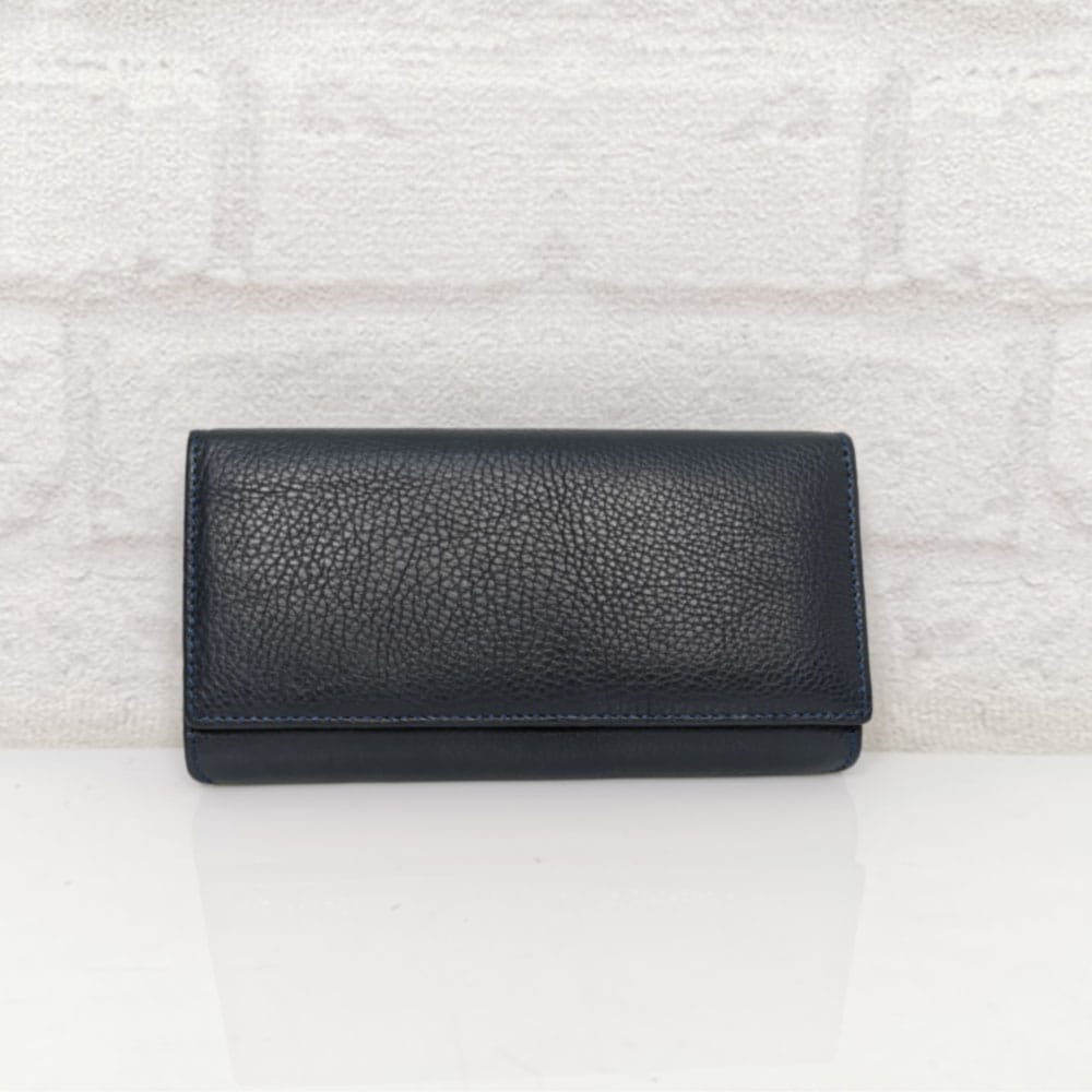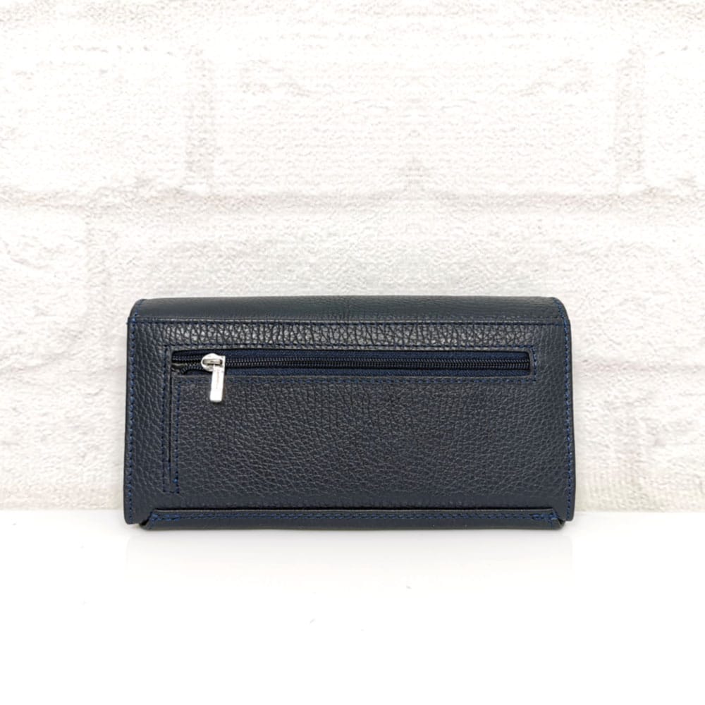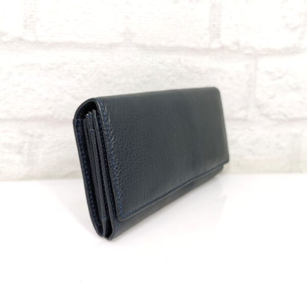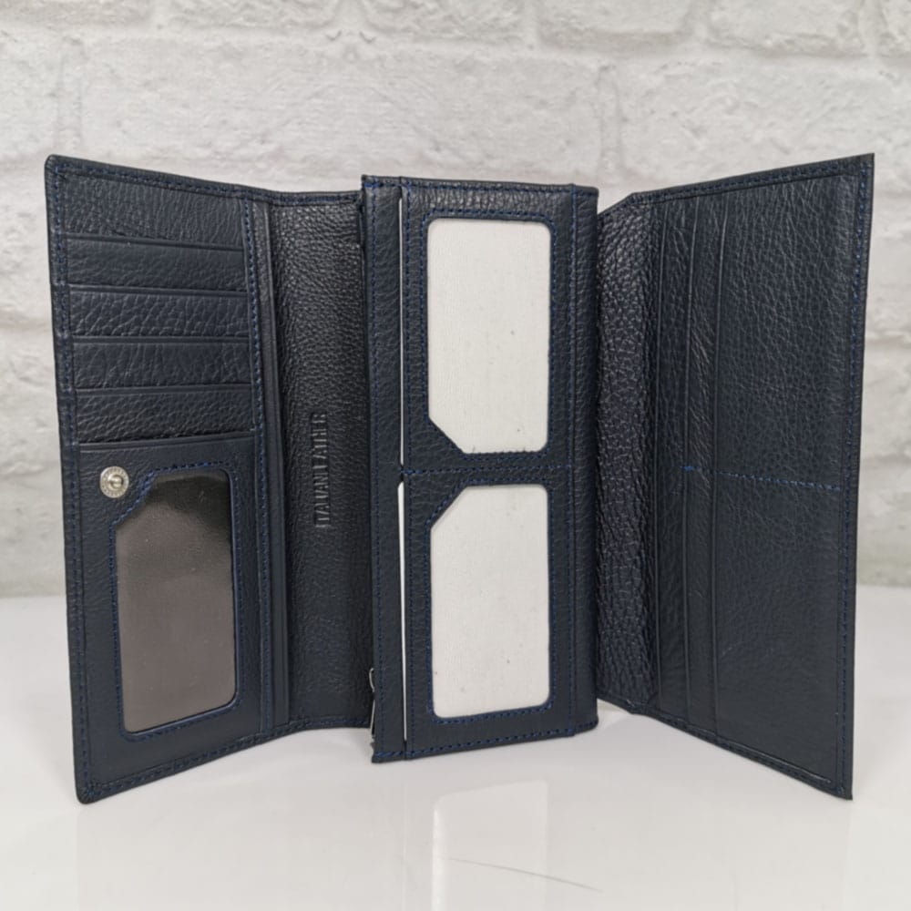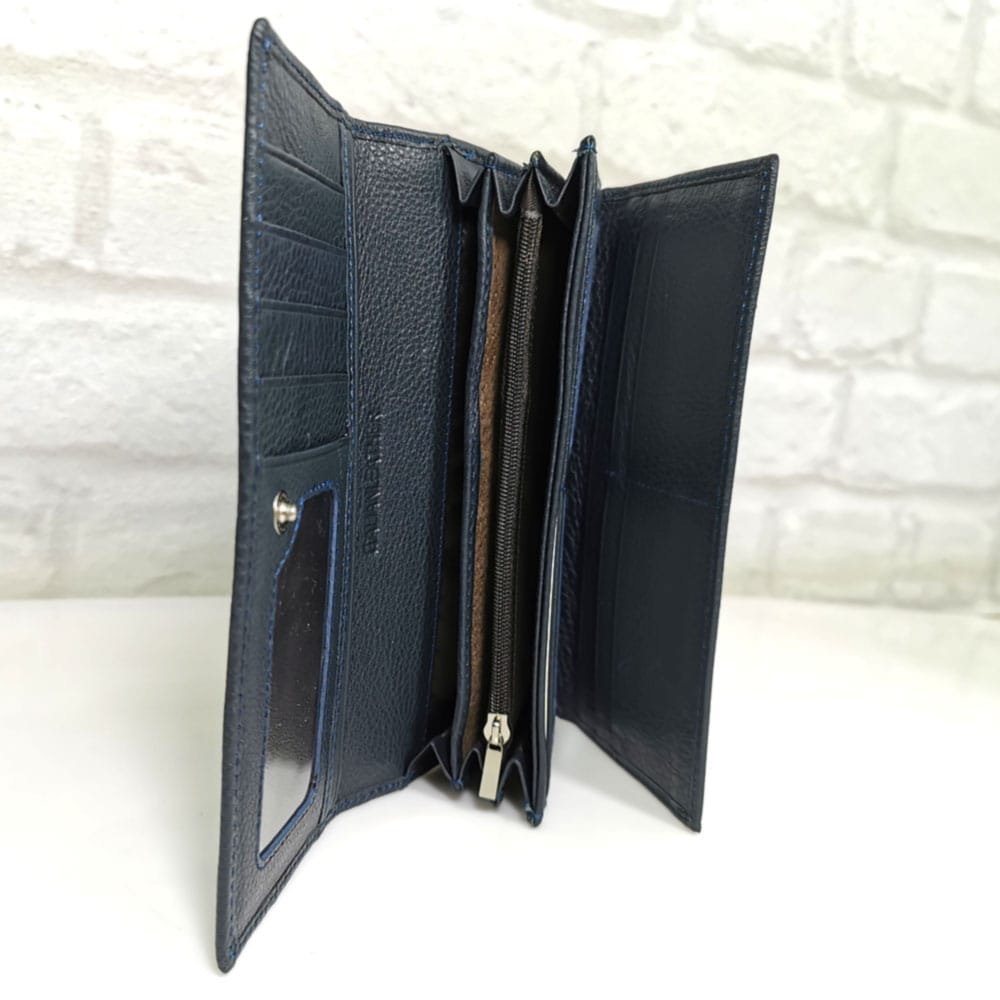 Пет прегради за банкноти , вътрешен монетник с цип, падащ борд с преграда и 4 прегради за визитки, на капака две големи прегради и 5 малки за визитки, две прозрачни отделения за карти, на гърба джоб с цип