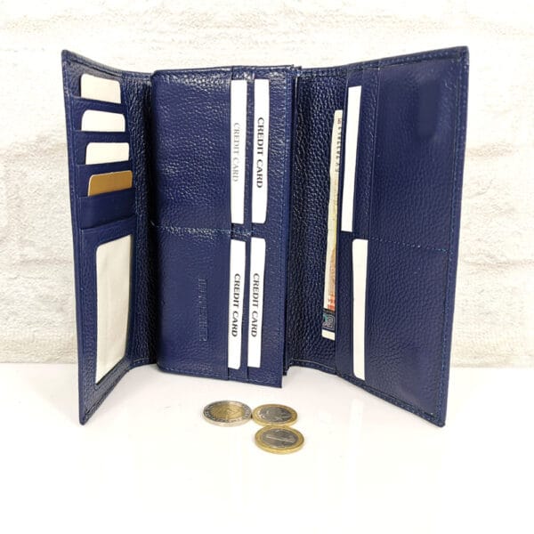 Основна част: 3 прегради, като една от тях е с цип, голям монетник с цип и средна преграда, падащ борд с един голям джоб и 9 малки отделения за карти, като едното е прозрачно; на капака от вътрешната страна има една голяма преграда и още 4 прегради за карти или визитки