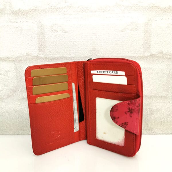 Една дълбока преграда за банкноти, 10 отделения за карти или визитки с различен размер, като едно от тях е прозрачно, голям външен монетник с цип и средна преграда.