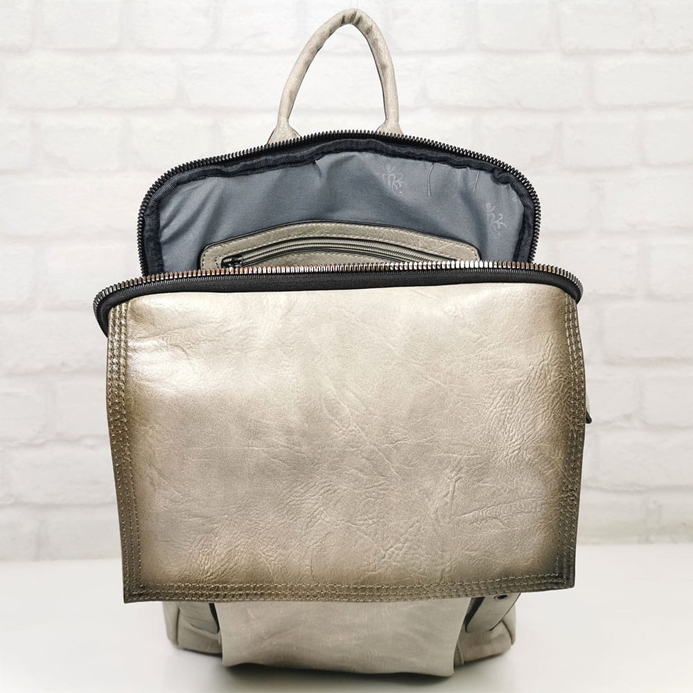 Раницата има две самостоятелни отделения-отпред под капака има голямо отделение с цип, а на гърба раницата има още едно голямо отделение с метален цип, в което можете да сложите лаптоп или документи и листове с формат А4.