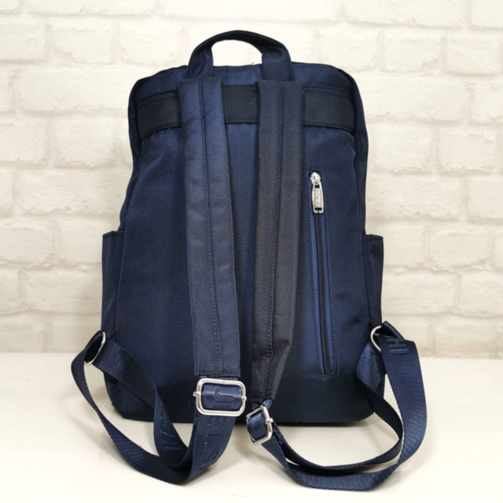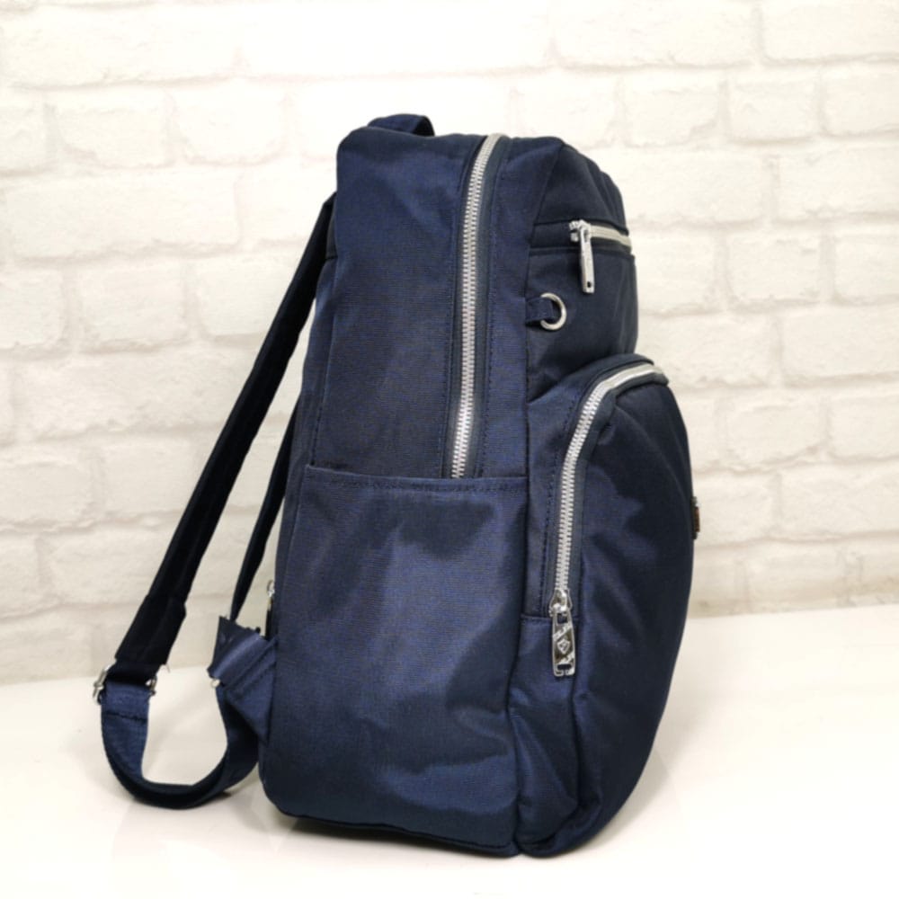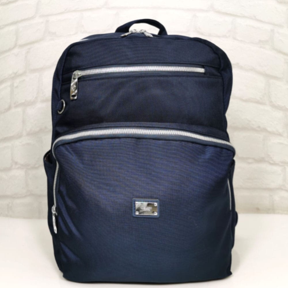 Отвън: на гърба вертикален джоб с цип, отпред два джоба с метални ципове, от двете страни по един джоб без закопчаване.