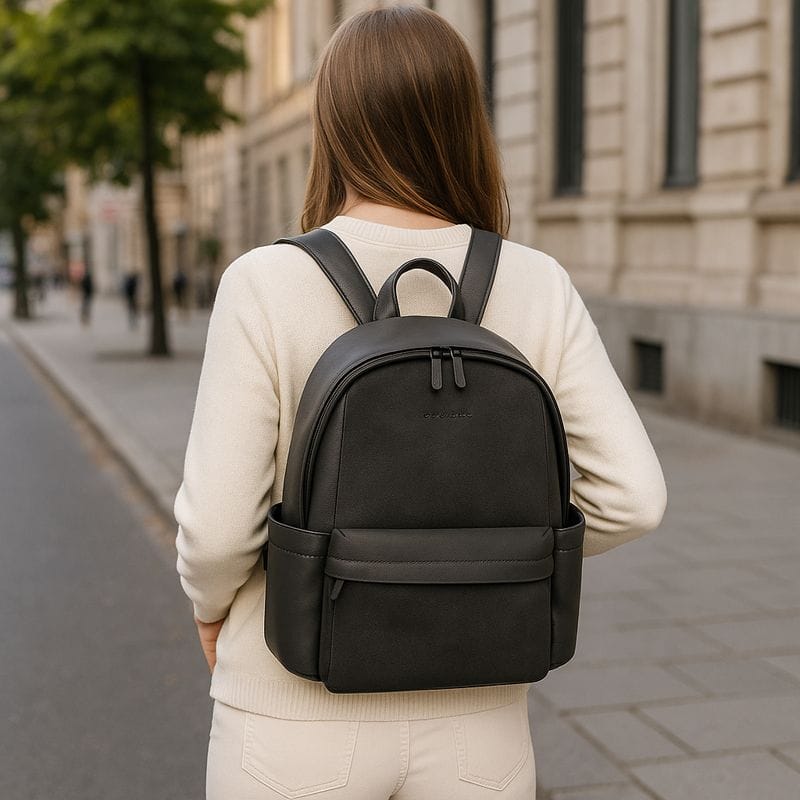 Стилна и практична дамска раница в универсален черен цвят, изработена от висококачествена еко кожа и велурена текстура отпред. Има практични джобчета и подходящ размер, както за деловото ежедневие, така и за пътуване. Побира листове с формат А4, има отделение за 13 инчов лаптоп. Оригинален дизайн на марката „David Jones“- Франция. Всички стоки са с преглед и тест! Безплатна доставка за заявки над 80.00лв./40.90€ до офис на транспортна фирма!