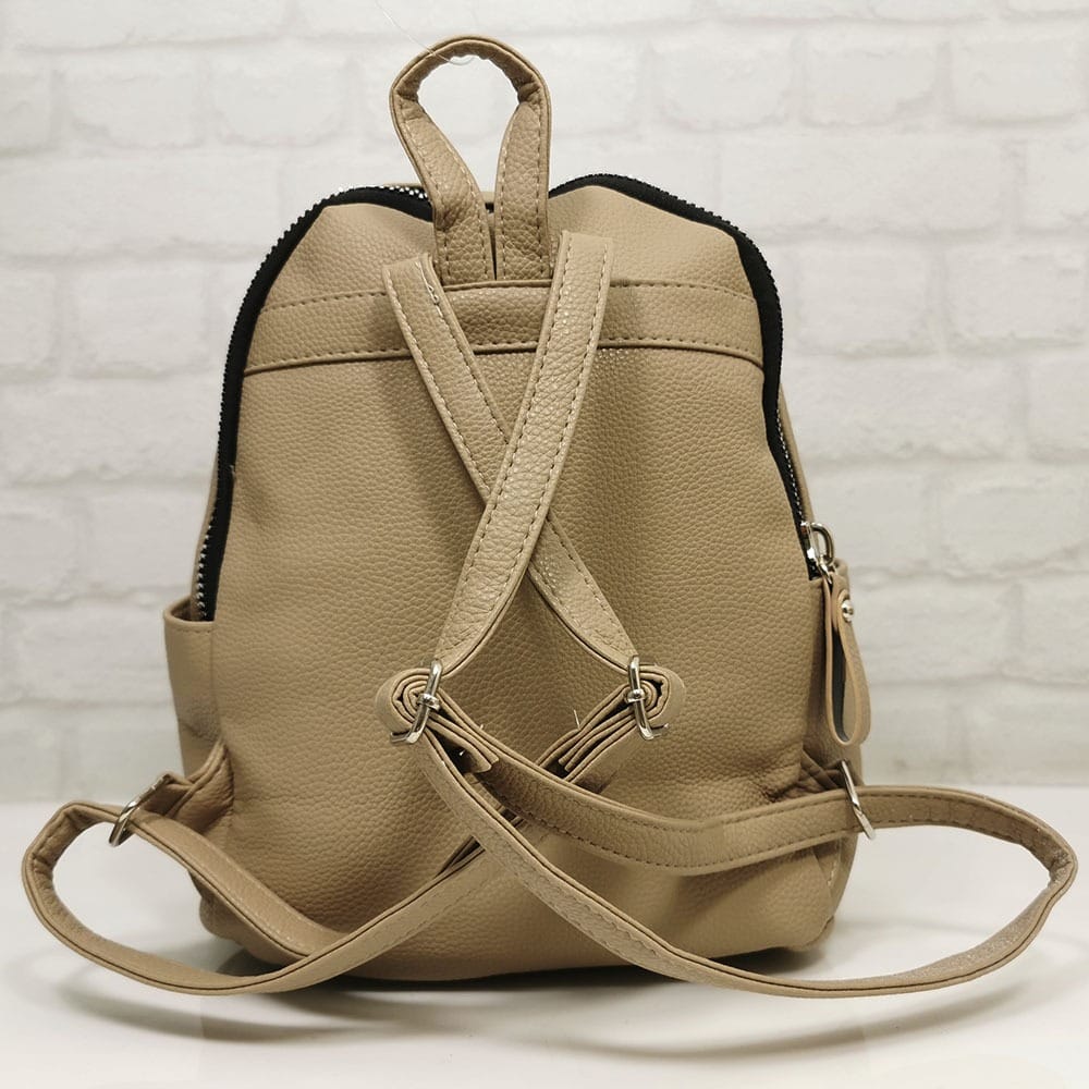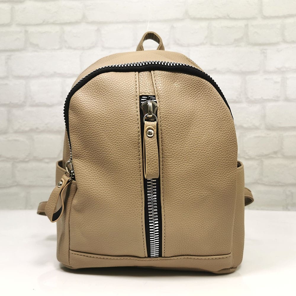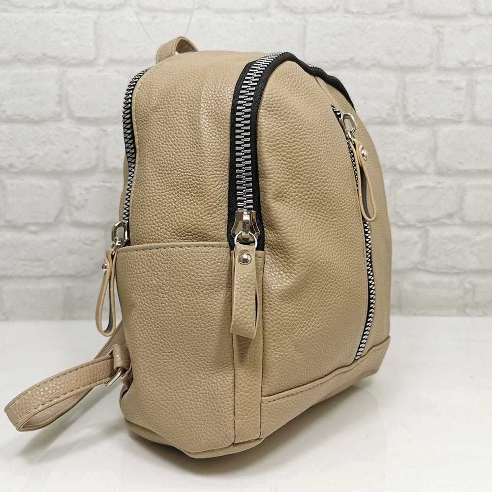 Средно голяма дамска раница в приятен пясъчен цвят с едър контрастен метален цип. Безплатна доставка за заявки над 60.00 лева до офис на транспортна фирма!