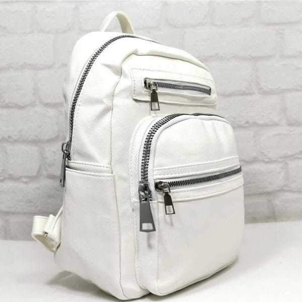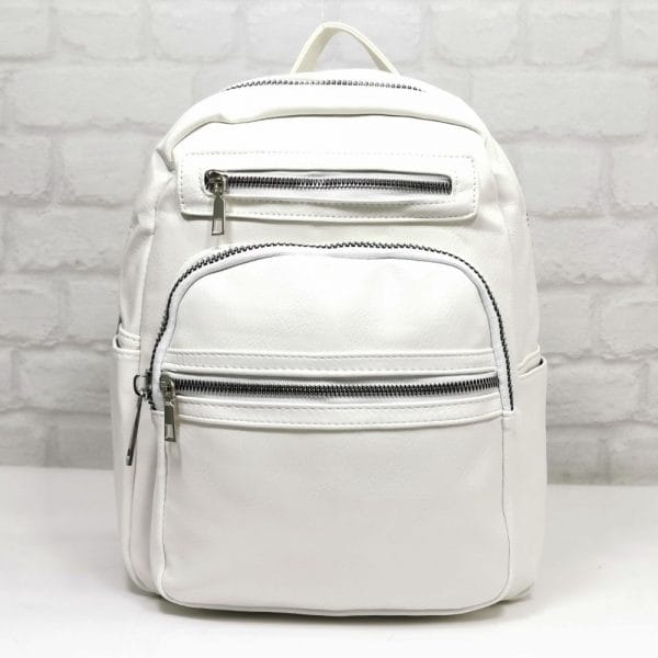 Отвън: отпред три джоба различни големини с бели метални ципове, отстрани по един джоб от двете страни, отзад на гърба джоб с цип