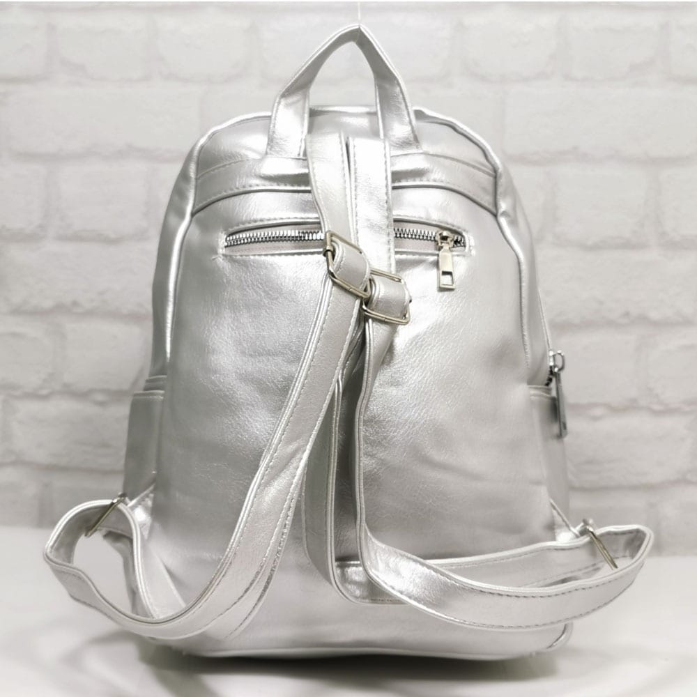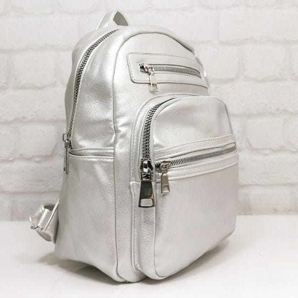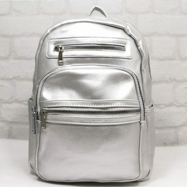Отвън: отпред три джоба различни големини с бели метални ципове, отстрани по един джоб от двете страни, отзад на гърба джоб с цип