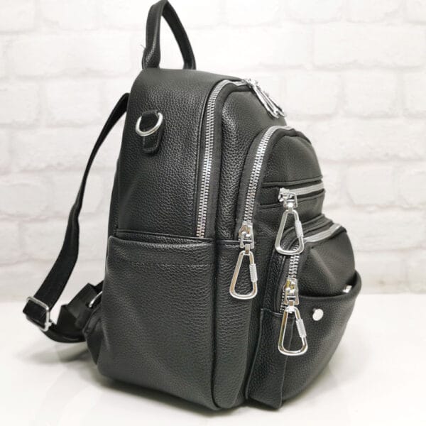 Отвън: отпред три джоба с цип и един малък с магнитно копче, на гърба джоб с цип, от двете страни по един джоб без закопчаване.