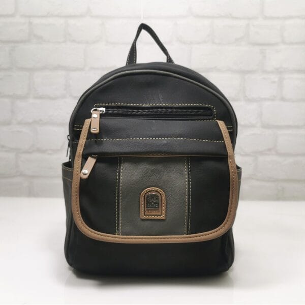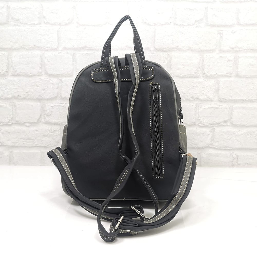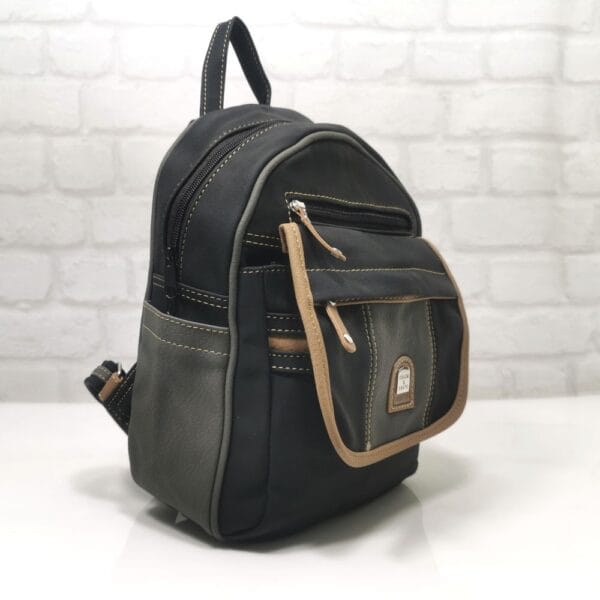 Отвън: отпред- малко джобче с цип, на капака джобче с цип, под капака джоб с цип и един без цип, две странични джобчета