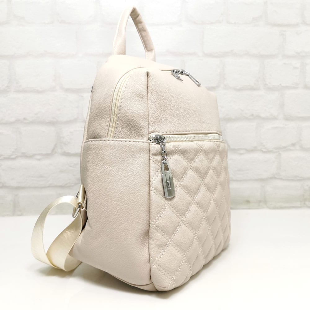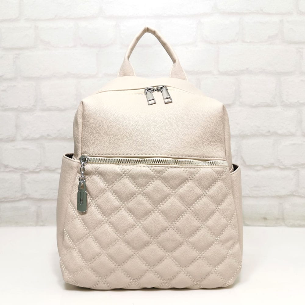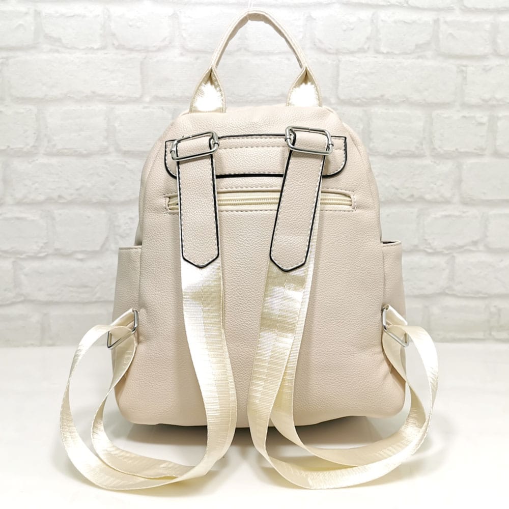 Отвън: отпред един джоб с метален цип, на гърба джоб с цип, от двете страни по един джоб без закопчаване.