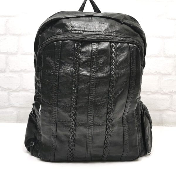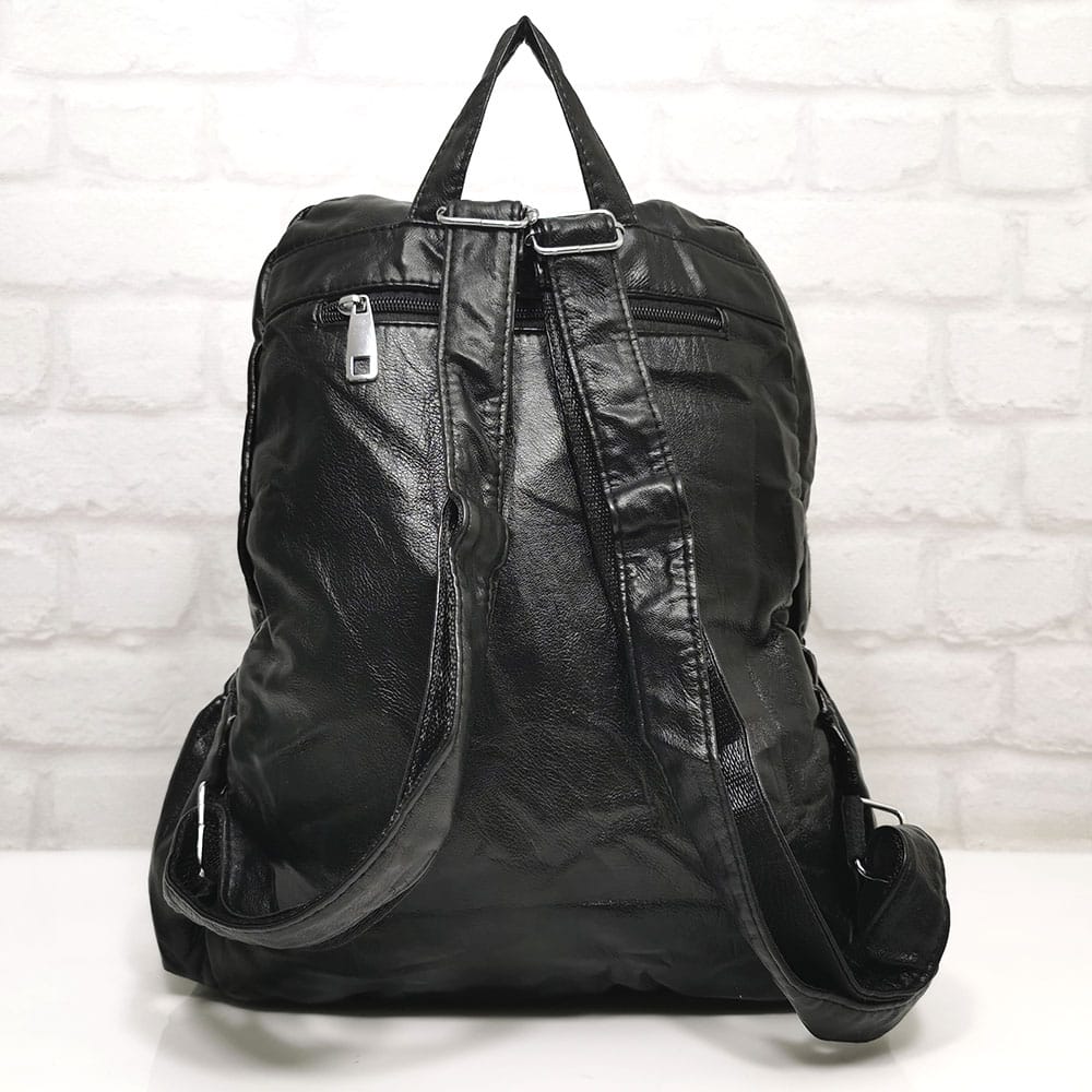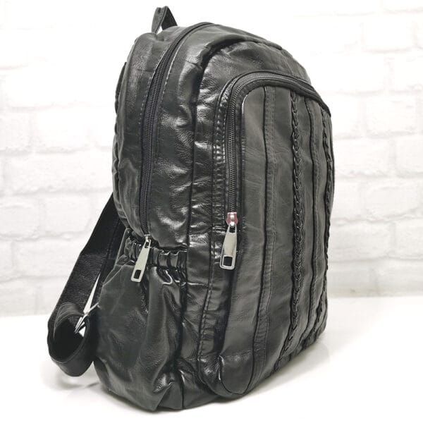 Отвън: по един джоб от двете страни с ластик, на гърба джоб с цип.