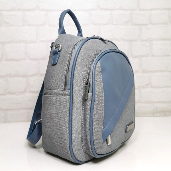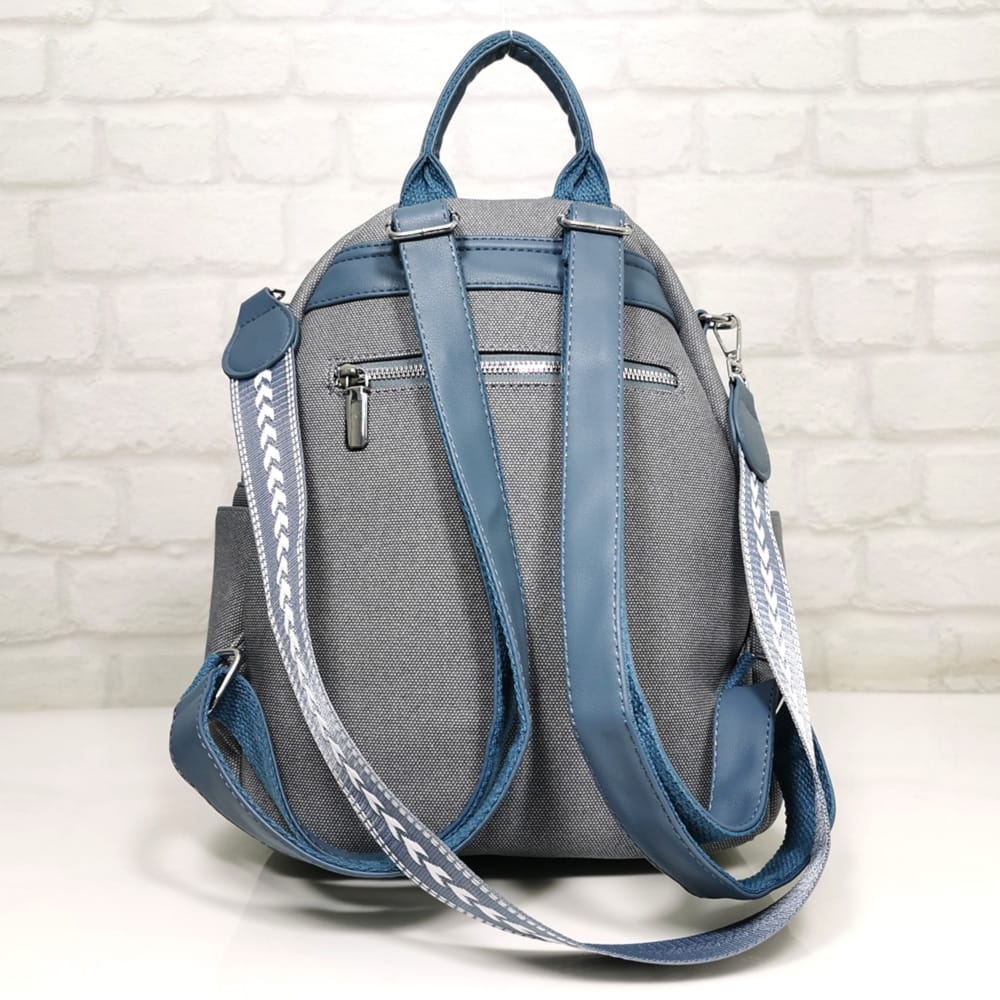 ПРИБЛИЗИТЕЛНИ РАЗМЕРИ Дължина на дъното: 27.5см. НАЧИН НА ЗАКОПЧАВАНЕ С метални ципове. ПРЕГРАДИ И ДЖОБОВЕ Отвън: отзад джоб с метален цип, отпред два джоба с метални ципове, от двете страни по един джоб без закопчаване. Отвътре: джобче за документи с цип, един джоб без цип. ДРЪЖКИ Две регулиращи се дръжки от еко кожа, подплатени с текстилна лента, една къса дръжка и една подвижна текстилна дръжка в два цвята, с дължина 70.0 см. за носене на раницата на едно рамо, като чанта. МАТЕРИАЛИ Еко кожа, хастар-полиестер, аксесоари от метал. ЦВЯТ Светло син, текстилна дръжка синя с бяло, обков метален сребрист. ПОДДРЪЖКА Да се почисти с мека леко влажна кърпа, да се пази от остри предмети и органични разтворители!