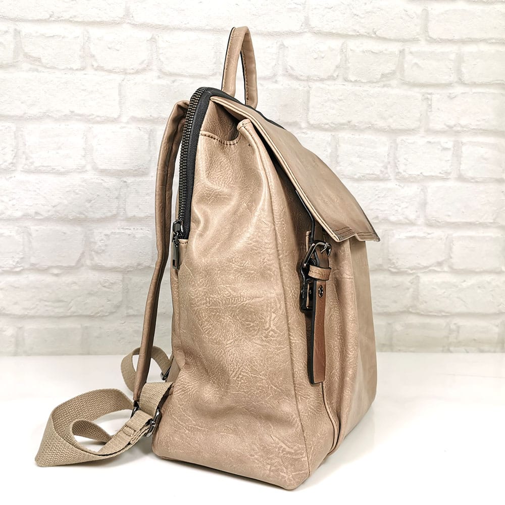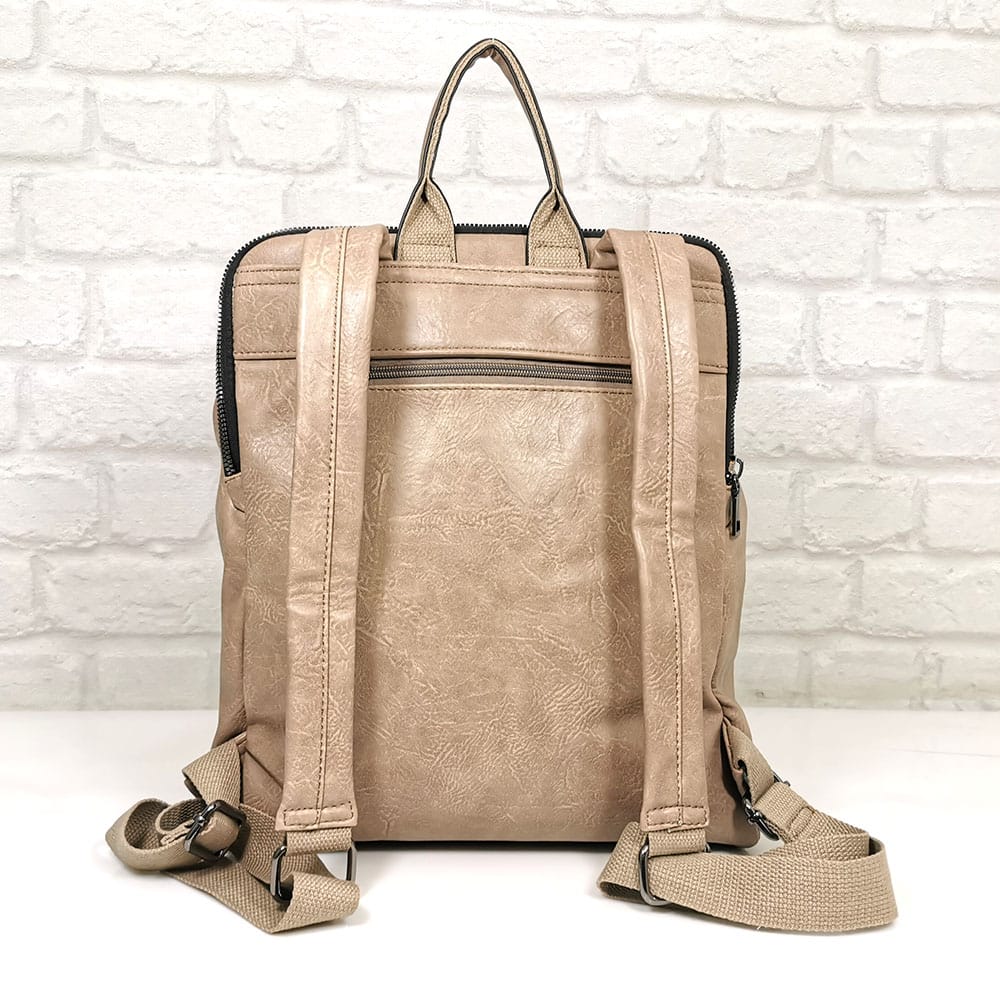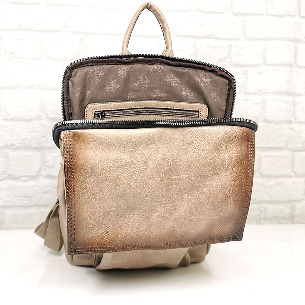Раницата има две самостоятелни отделения-отпред под капака има голямо отделение с цип, а на гърба раницата има още едно голямо отделение с метален цип, в което можете да сложите лаптоп или документи и листове с формат А4.