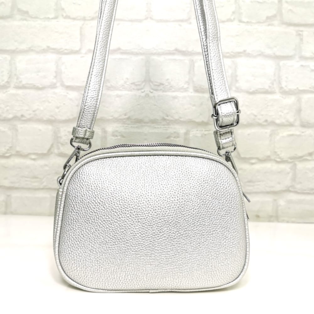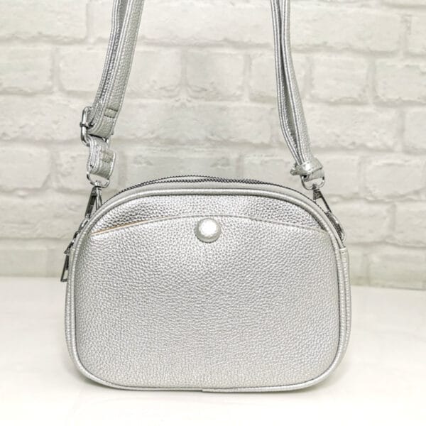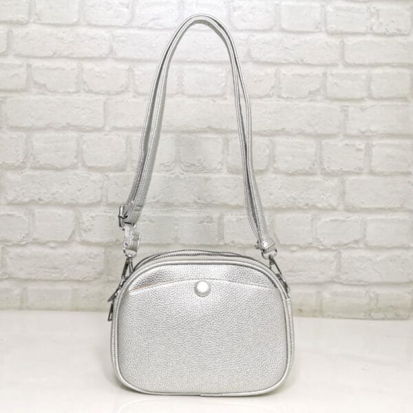 Тази сребриста дамска чанта през рамо е перфектният бляскав акцент за всеки повод. С компактен размер, но достатъчно пространство за най-важното – телефон, документи, червило и още малко шик. Изработена от висококачествена еко кожа с метален отблясък, тази чанта излъчва изтънченост. С дълга регулируема дръжка можеш да я носиш през рамо или crossbody. Подходяща е както за ежедневие, така и за официални събития.