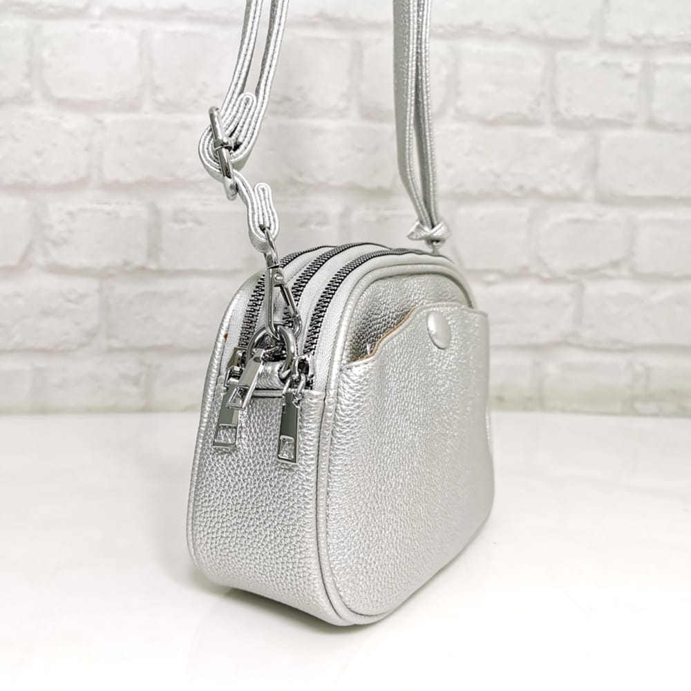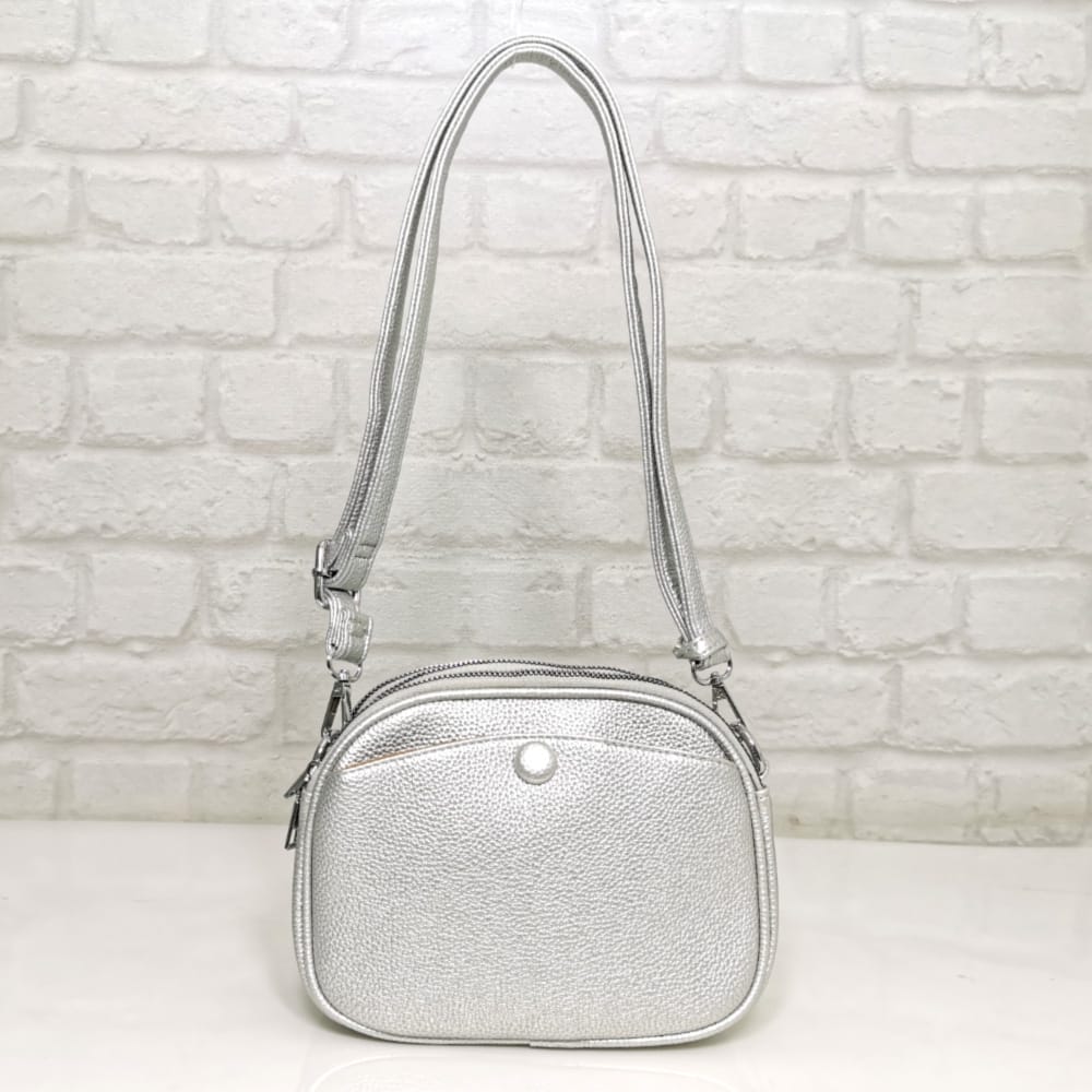 Търсиш аксесоар, който да привлече вниманието? ПРИБЛИЗИТЕЛНИ РАЗМЕРИ Дължина в горната част: 20.0см. Дължина на дъното: 20.0см. НАЧИН НА ЗАКОПЧАВАНЕ С метални ципове и магнитно копче на предния джоб. ПРЕГРАДИ И ДЖОБОВЕ Три отделни прегради, всяка се закопчава с метален цип. Отвътре: без джобове. Отвън: отпред джоб с магнитно копче. ДРЪЖКИ Една подвижна дълга регулираща се дръжка. МАТЕРИАЛ Еко кожа, хастар-полиестер, аксесоари от метал. ЦВЯТ Сребрист, обков метален, сребрист. ПОДДРЪЖКА Да се почиства с мека и леко влажна кърпа, да се пази от остри предмети и органични разтворители!