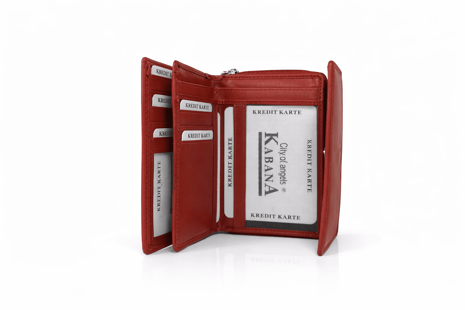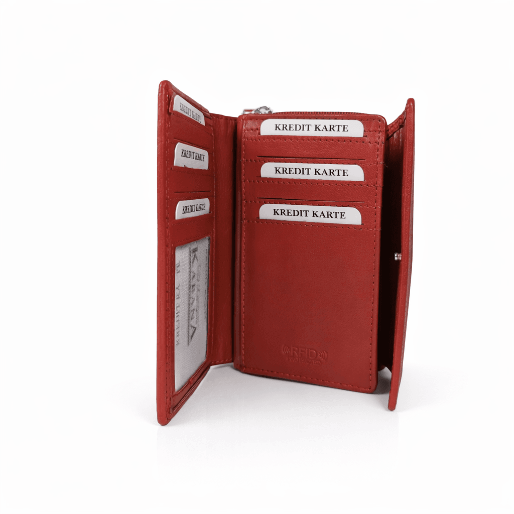 Тъмно червено портмонедамско портмоне от естествена кожа в елегантен червен цвят, с удобно разпределение за карти, банкноти и монети. Практичен модел за ежедневието, съчетаващ стил и удобство. Моделът е оборудван със сигурна RFID защита, която предпазва вашите банкови карти и лични документи от неоторизирано сканиране.