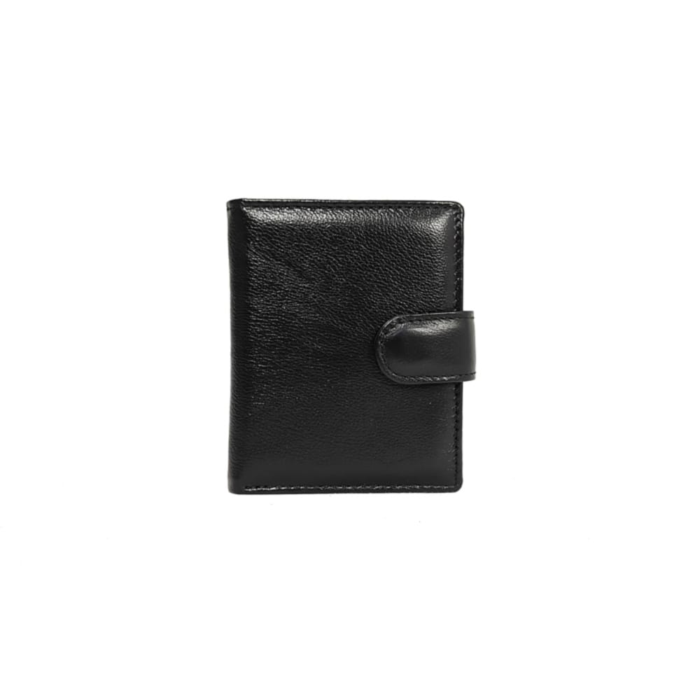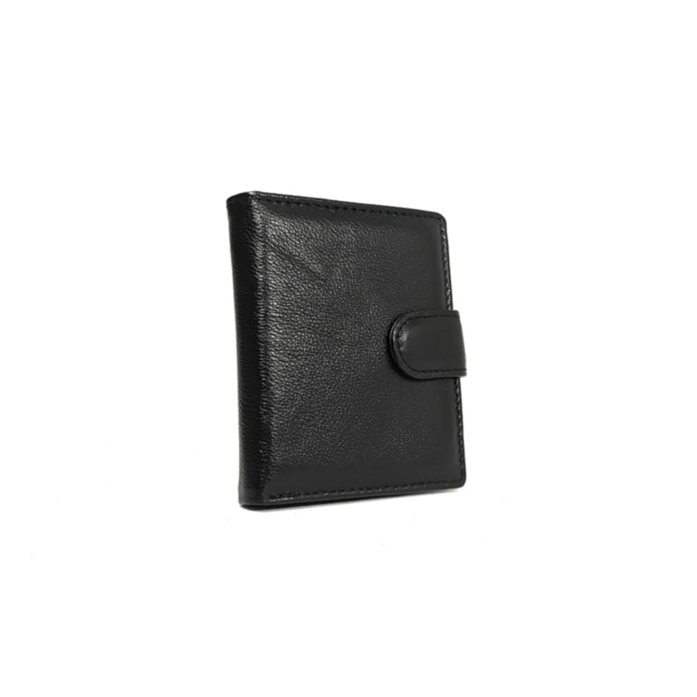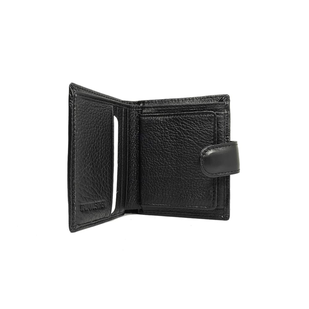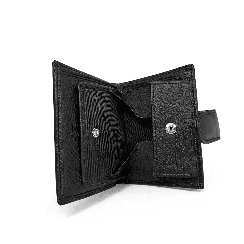 Вертикален черен портфейл от естествена кожа, с практично и компактно разпределение. Закопчава се с езиче със скрито магнитно копче и разполага с вътрешен монетник с копче тик-так. Портфейлът е малък на размер, но достатъчно дълбок, така че банкнотите се събират изцяло и не изстърчат. Подходящ за ежедневна употреба.